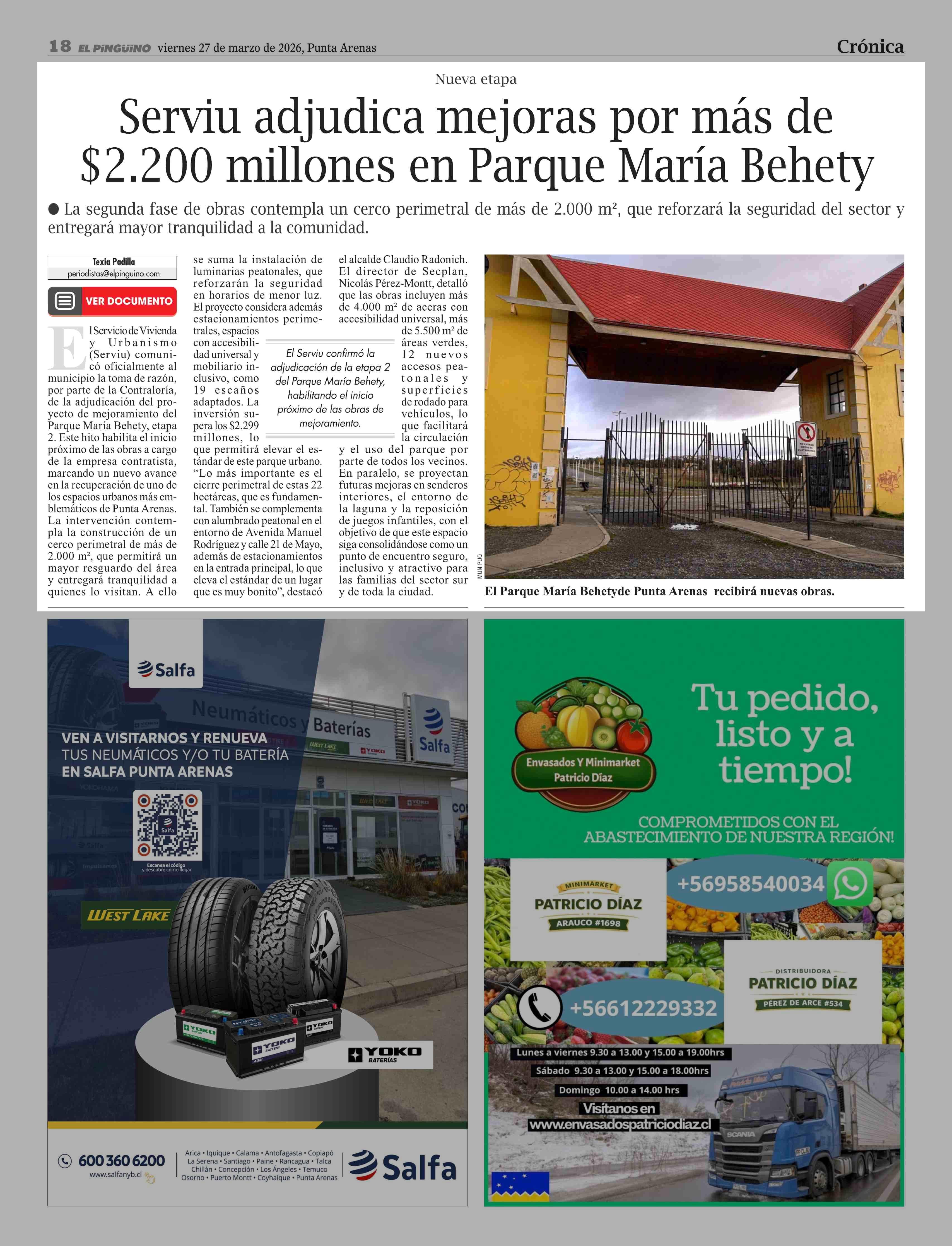 Serviu adjudica mejoras por más de $2.200 millones en Parque María Behety 27-03-2026 El Pingüino |
