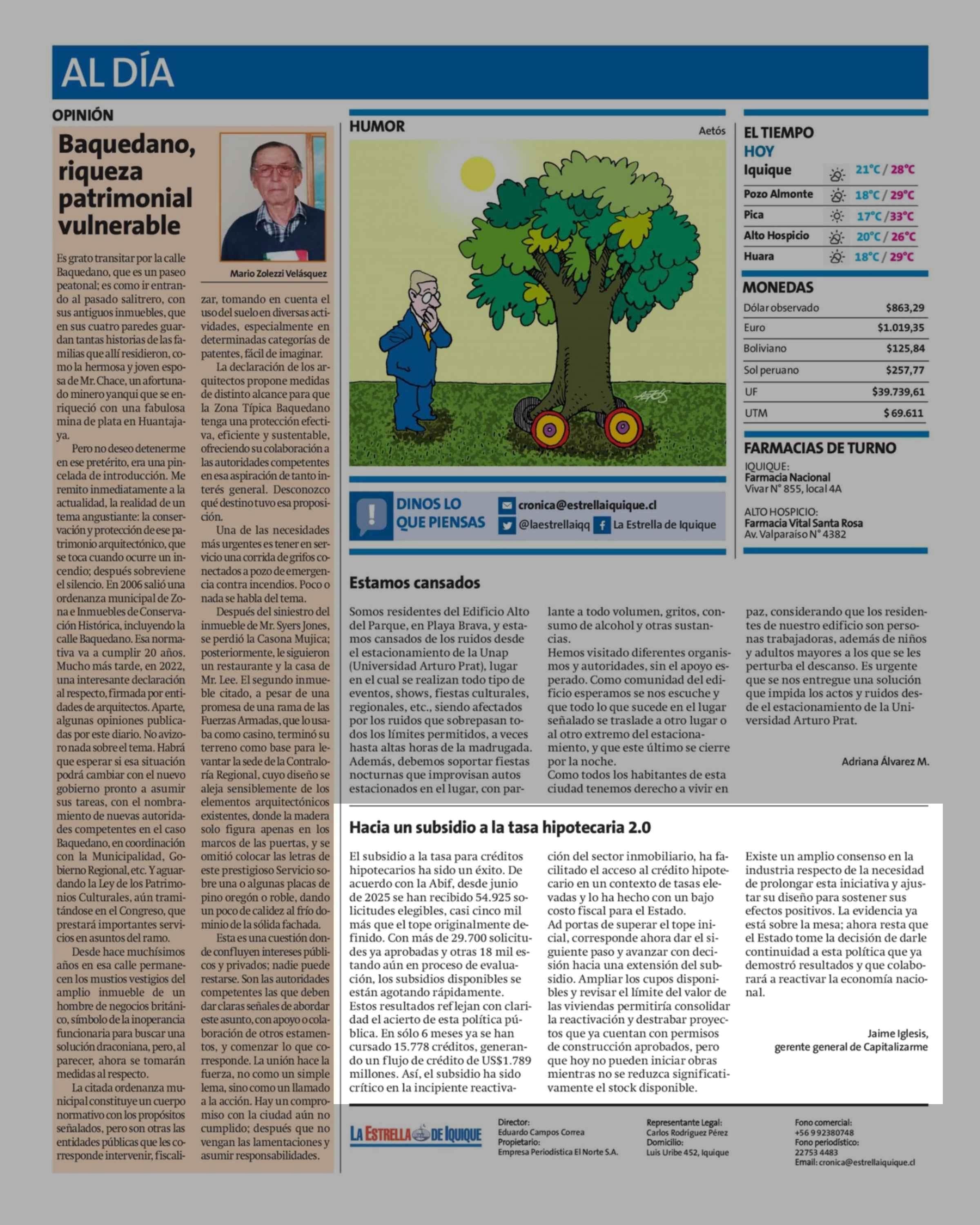 Cartas: Hacia un subsidio a la tasa hipotecaria 2.0 19-02-2026 La Estrella de Iquique |