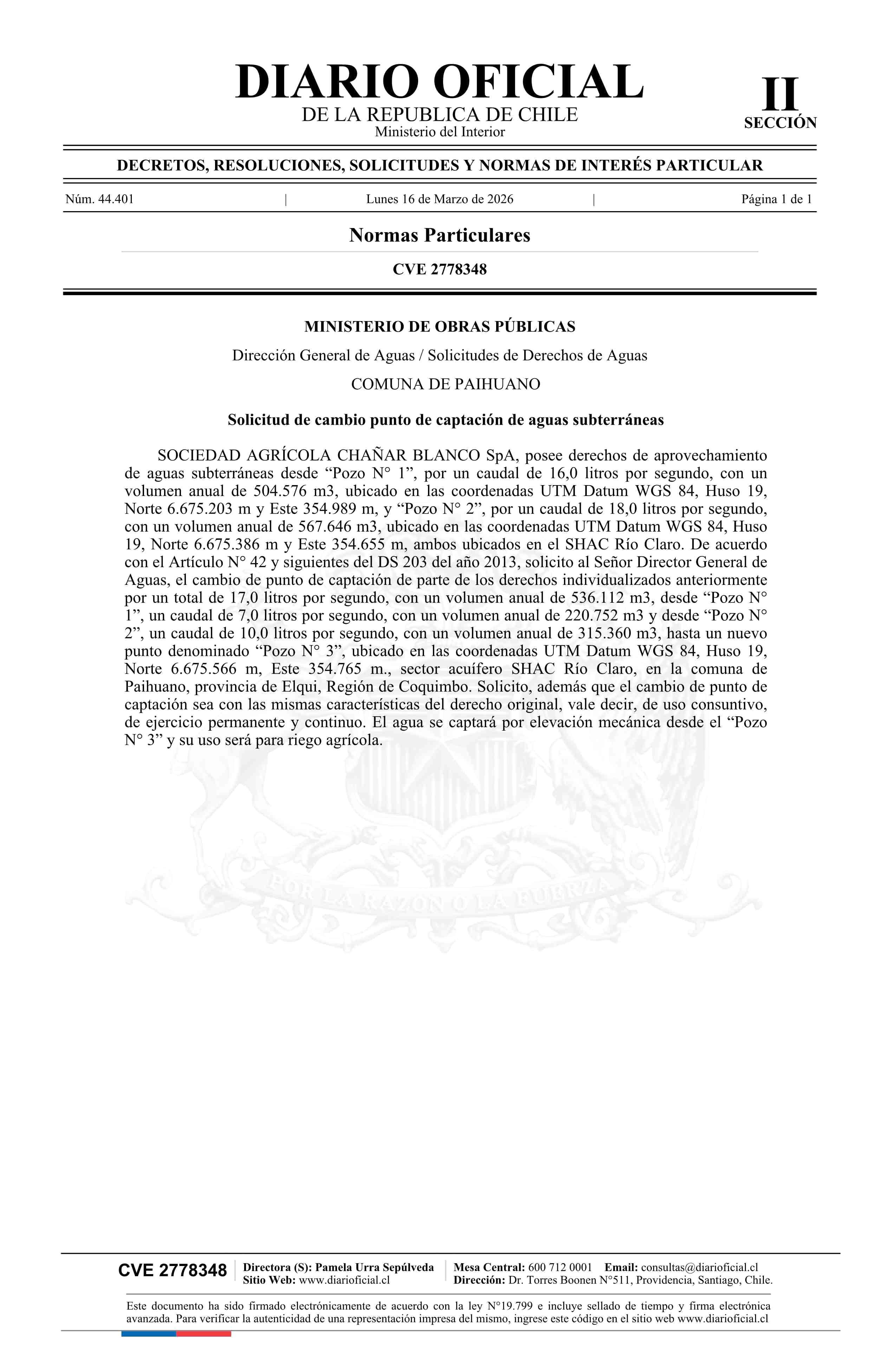 Título: Solicitud Sociedad Agrícola Chañar Blanco SpA