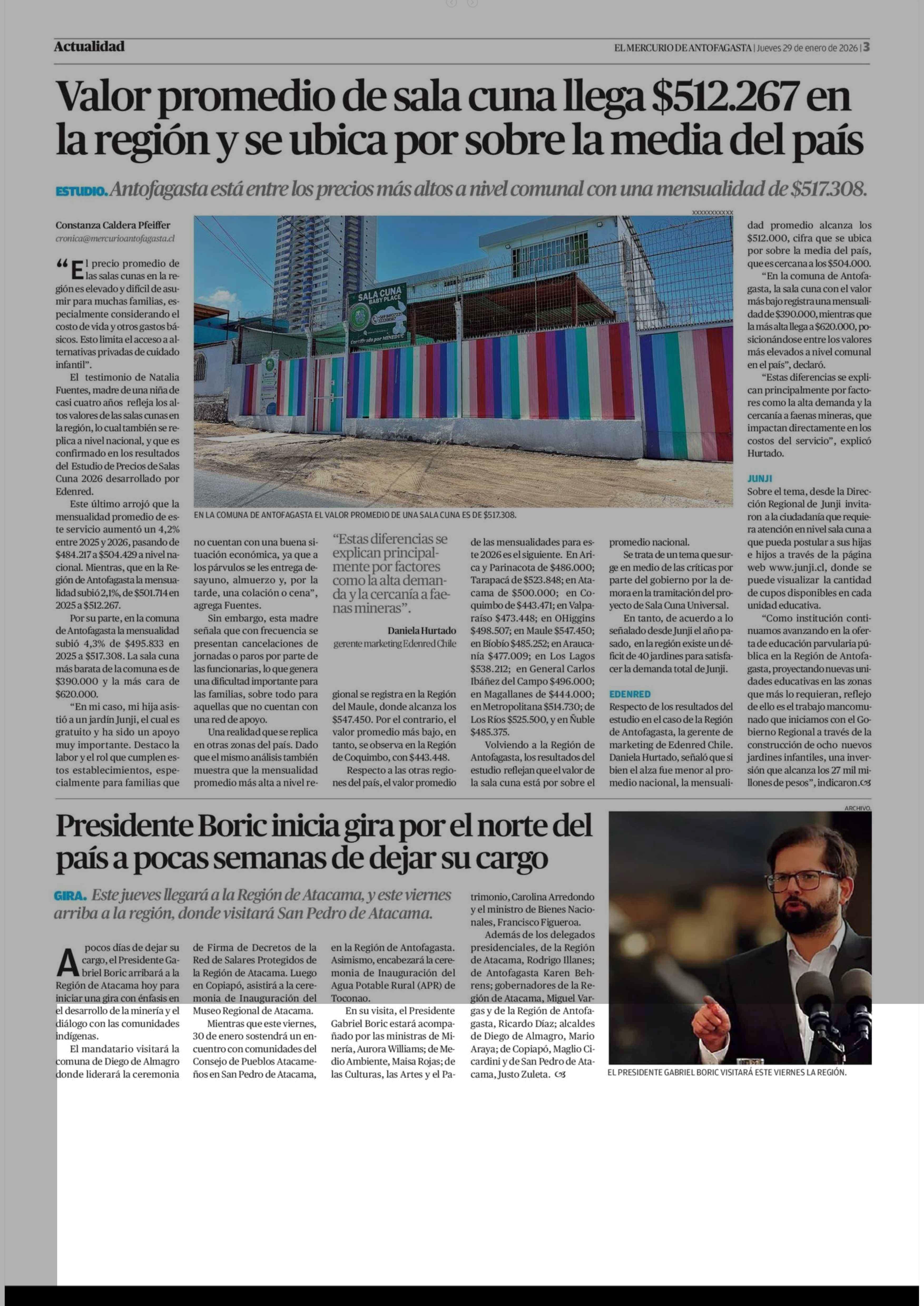Presidente Boric inicia gira por el norte del país a pocas semanas de dejar su cargo 29-01-2026 El Mercurio de Antofagasta |