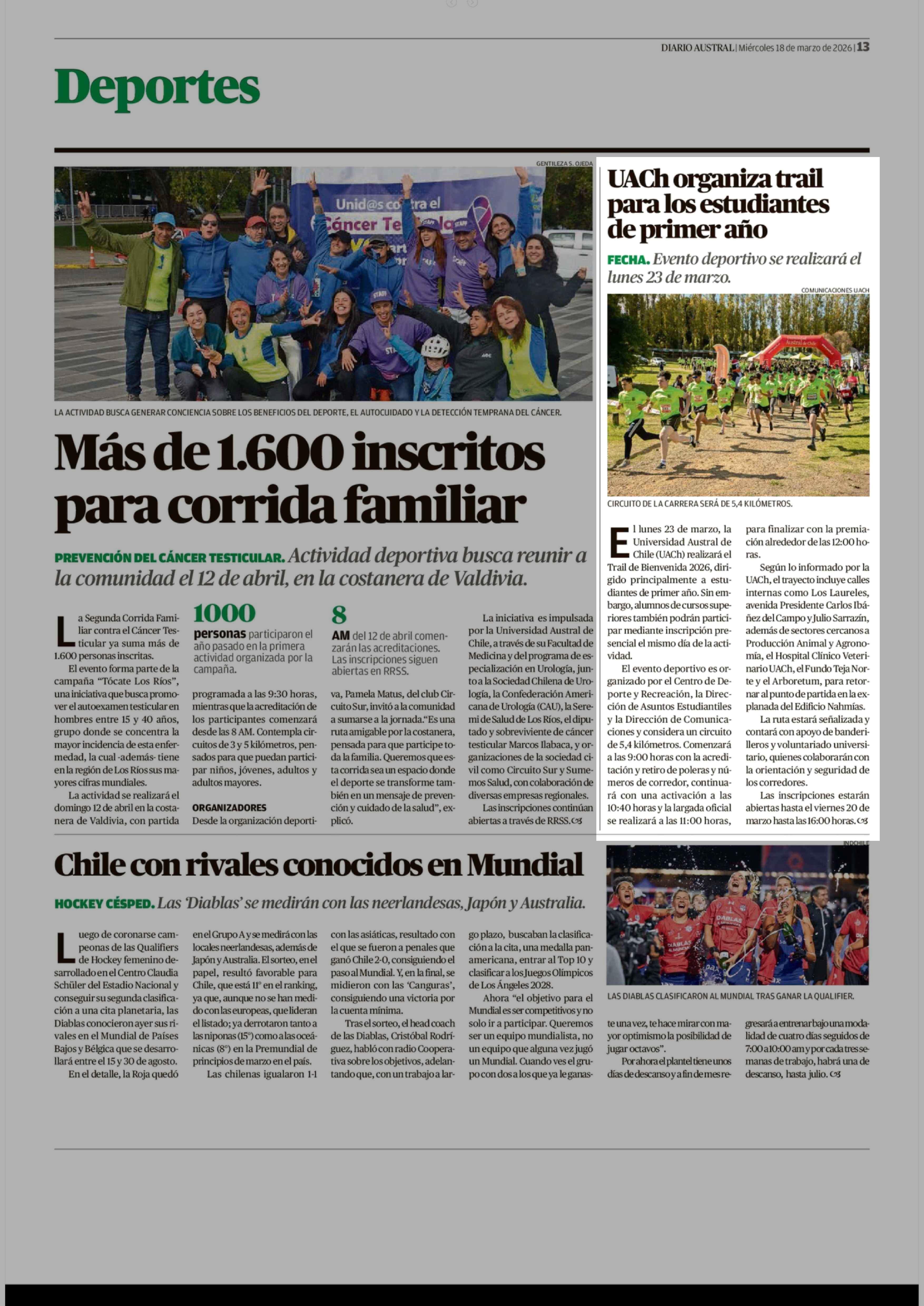 UACh organiza trail para los estudiantes de primer año 18-03-2026 Diario Austral Región de Los Ríos |