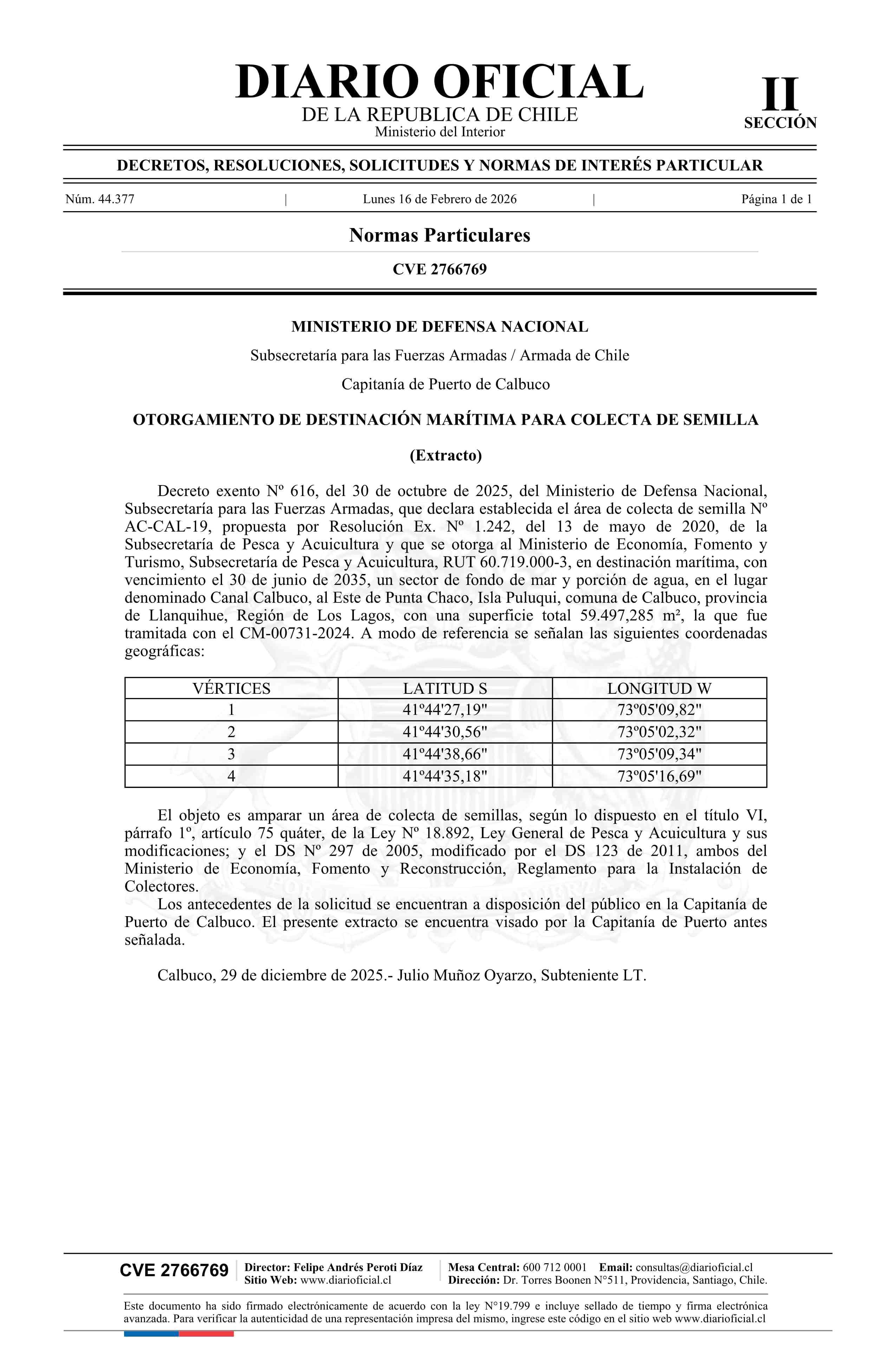 Extracto de decreto exento número 616, de 2025.- Otorgamiento de destinación marítima para colecta de semilla 16-02-2026 Diario Oficial Edición Electrónica |