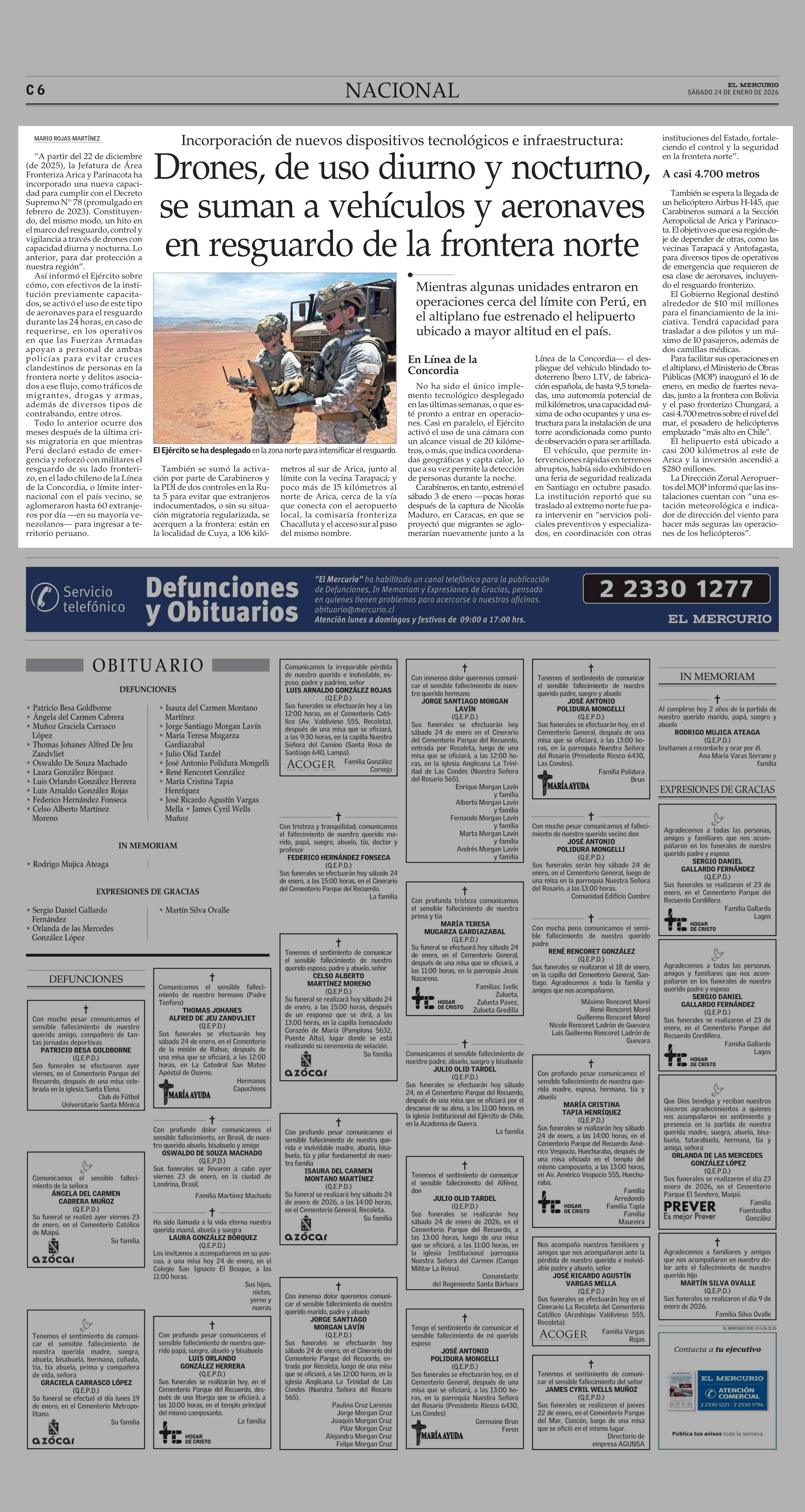 Drones, de uso diurno y nocturno, se suman a vehículos y aeronaves en resguardo de la frontera norte 24-01-2026 El Mercurio |