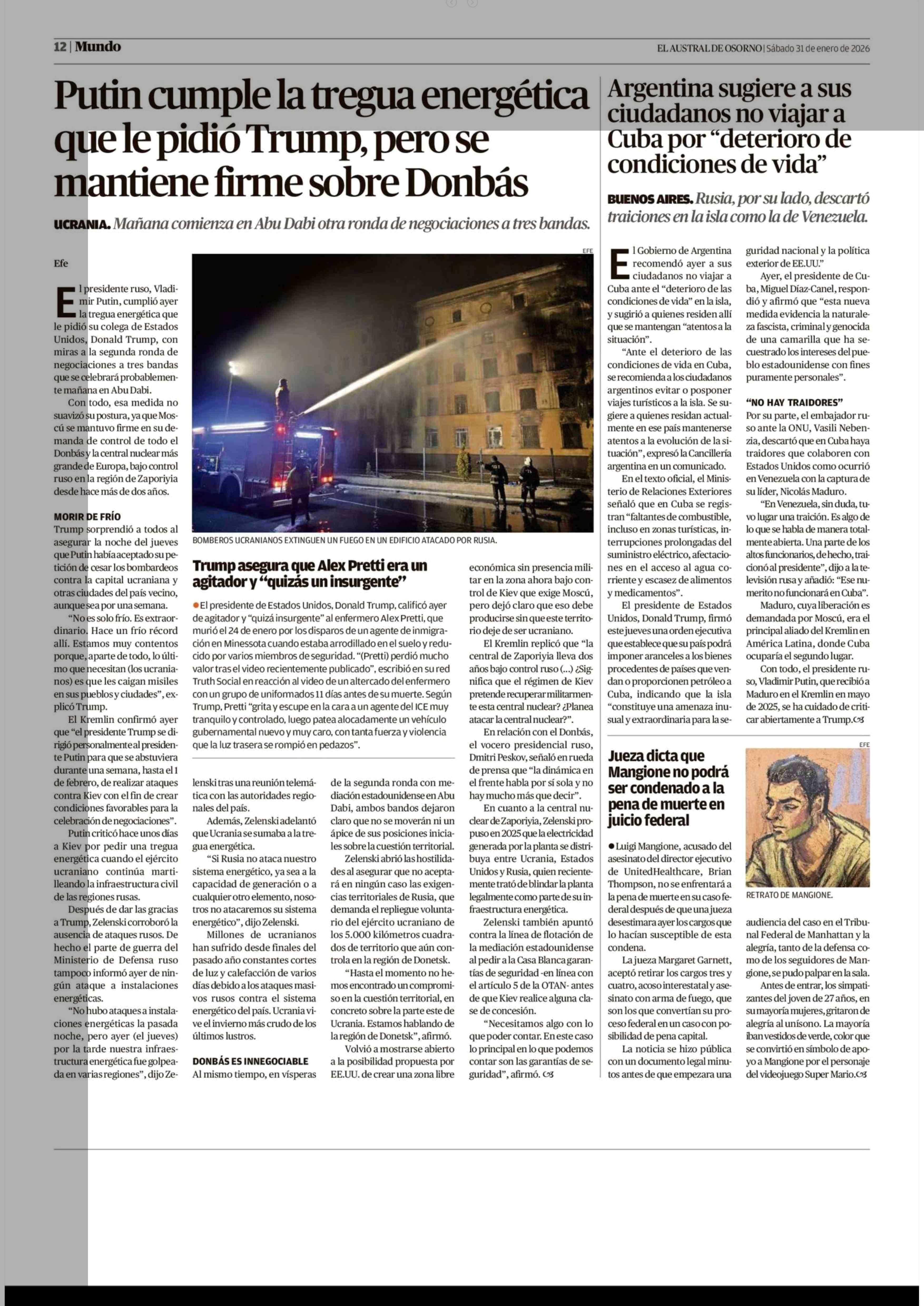 Putin cumple la tregua energética que le pidió Trump, pero se mantiene firme sobre Donbás 31-01-2026 El Austral de Osorno |