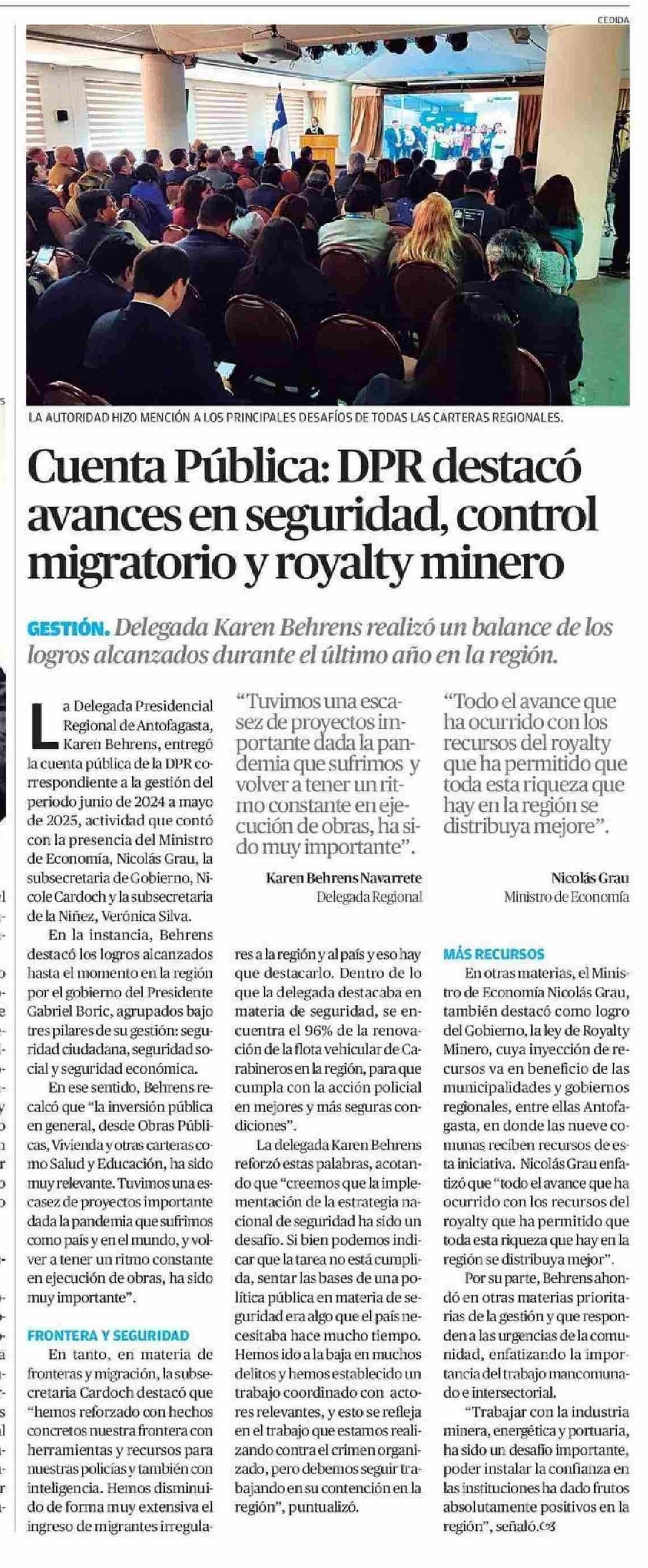 Cuenta Pública: DPR destacó avances en seguridad, control migratorio y royalty minero 20-06-2025 El Mercurio de Antofagasta |