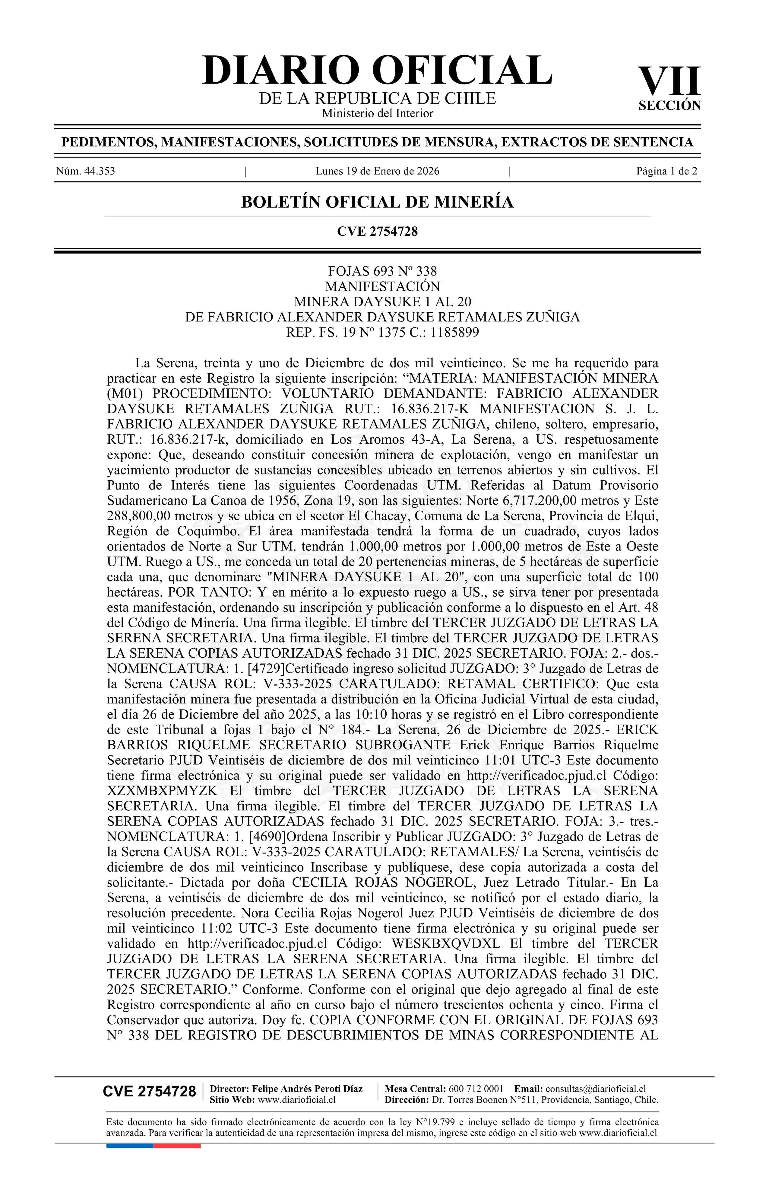 MINERA DAYSUKE 1 AL 20 / Retamales Zúñiga Fabricio Alexander Daysuke 19-01-2026 DIARIO OFICIAL CHILE - BOLETÍN OFICIAL DE MINERÍA |