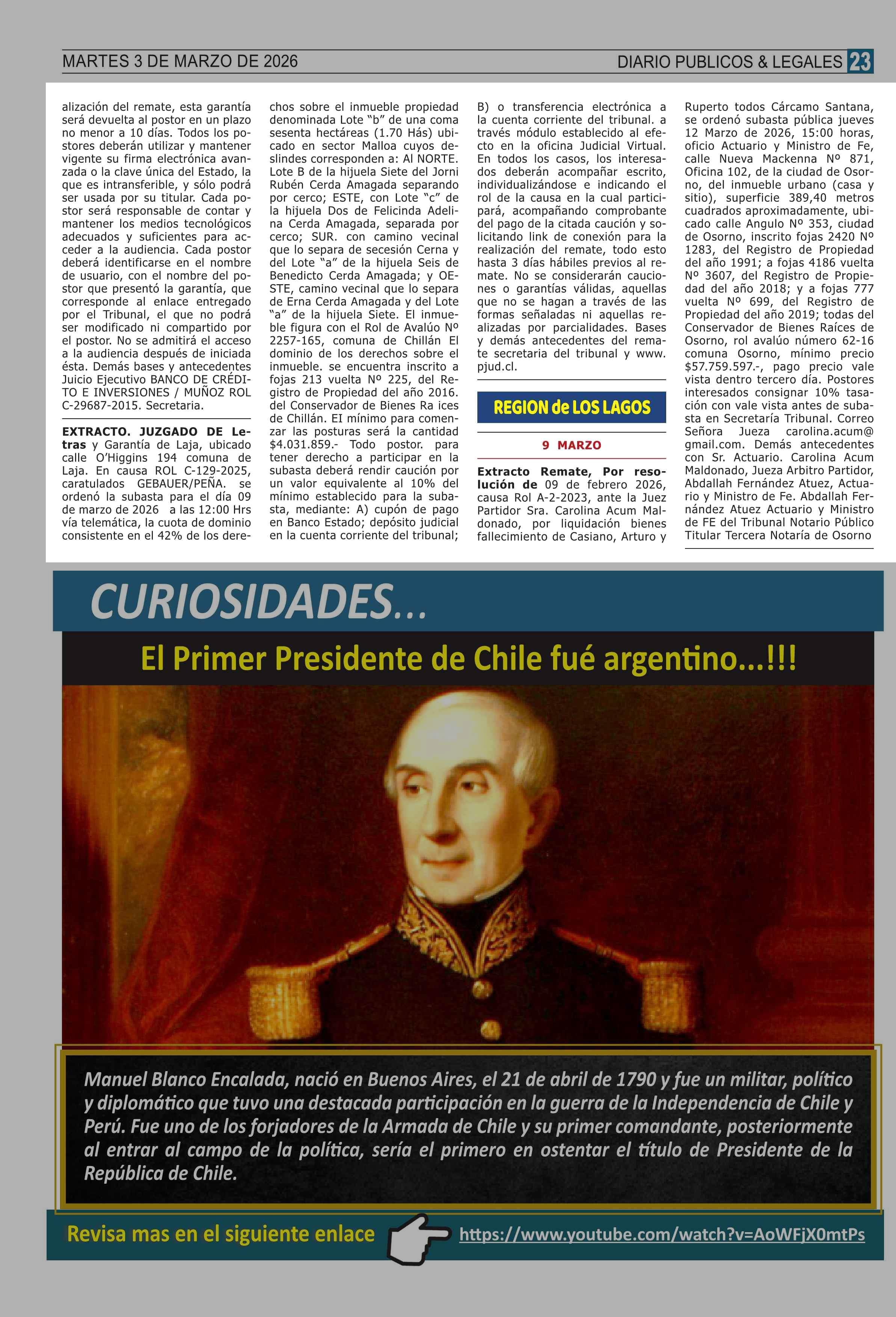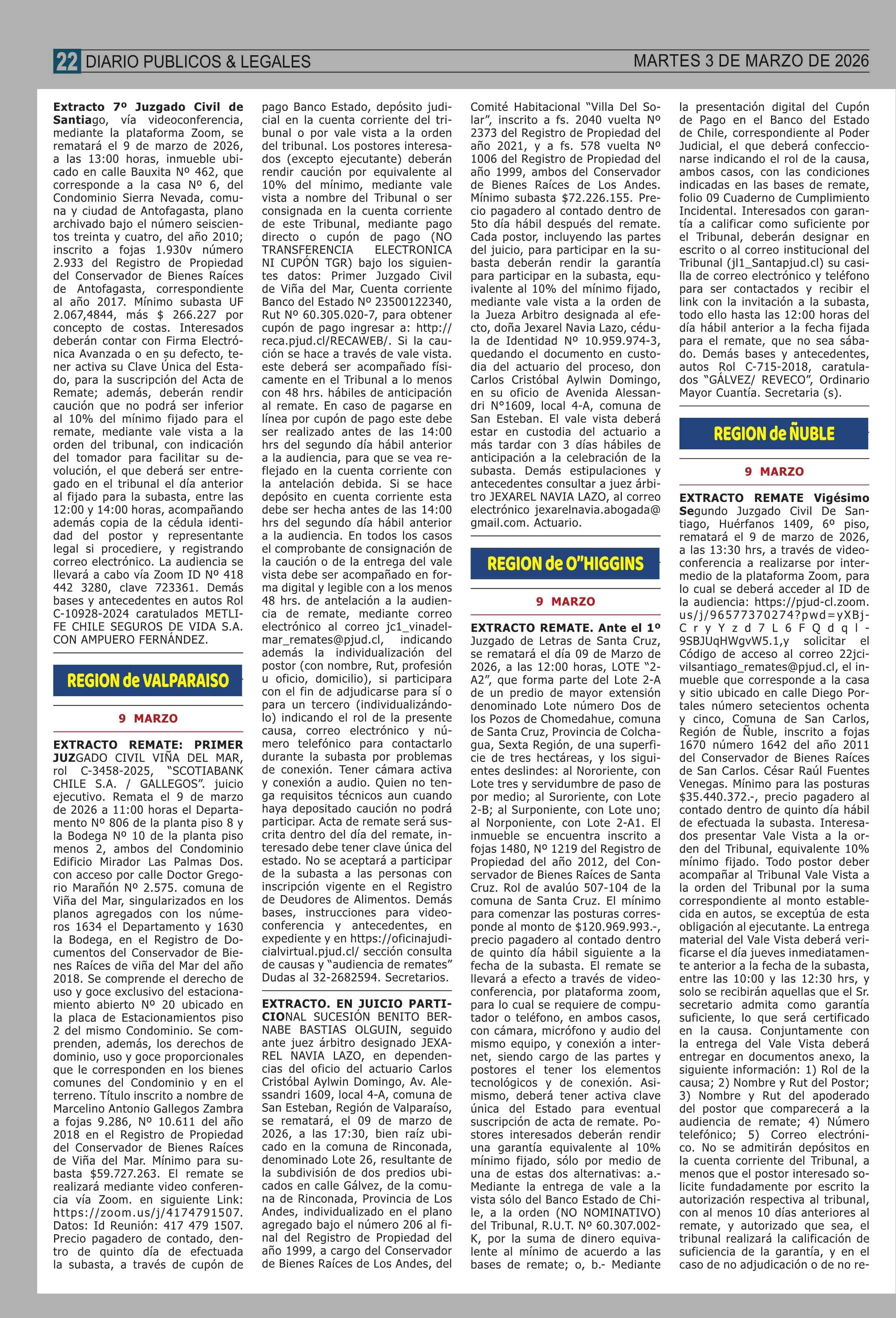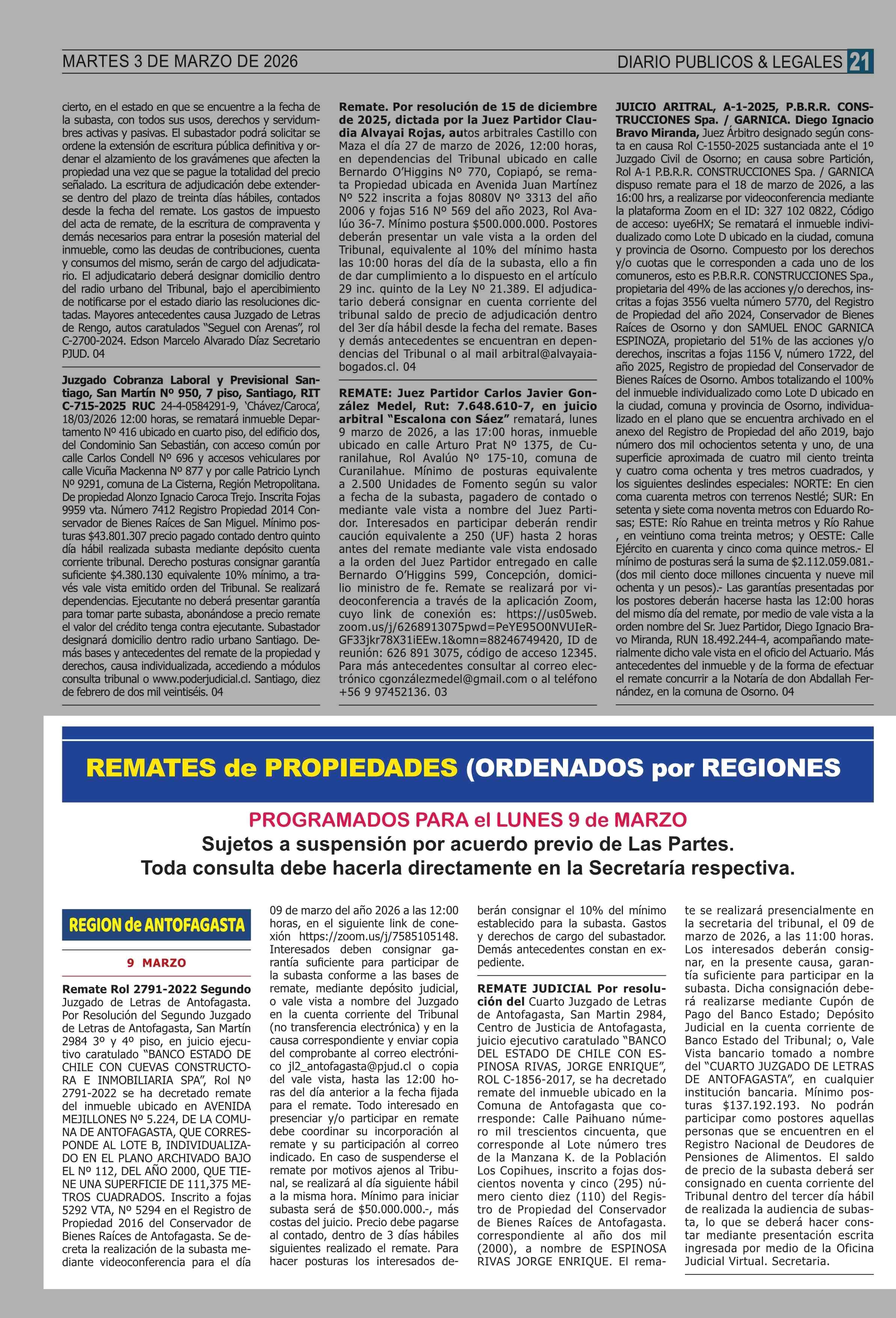 REMATES: REMATES de PROPIEDADES (ORDENADOS por REGIONES 03-03-2026 P&L Públicos y Legales |