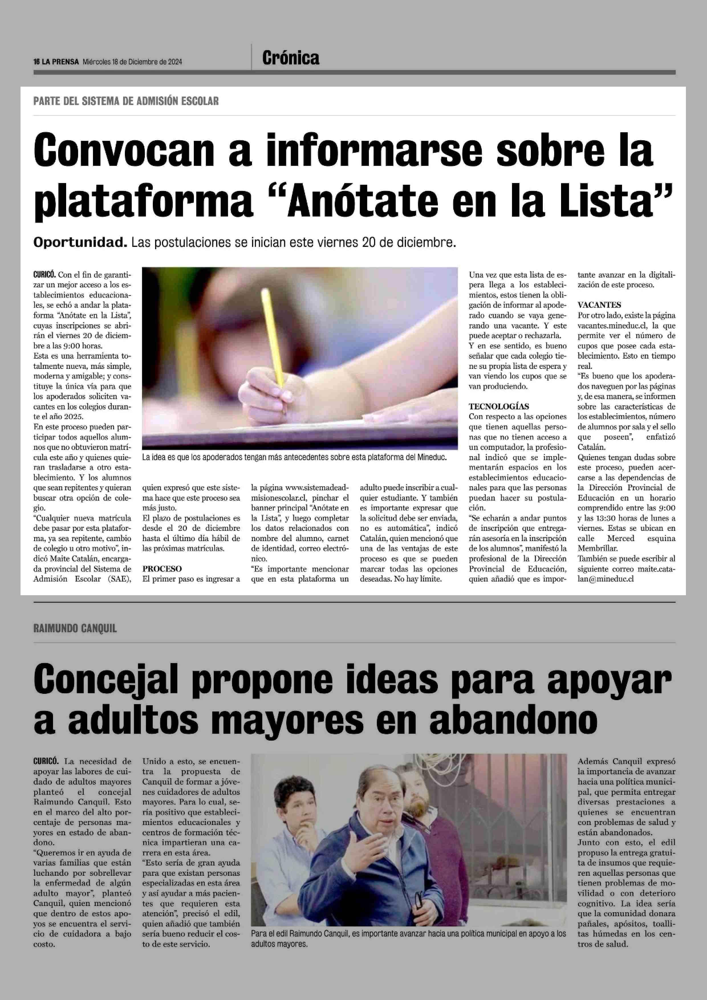 Convocan a informarse sobre la plataforma “Anótate en la Lista” 18-12-2024 La Prensa de Curicó |