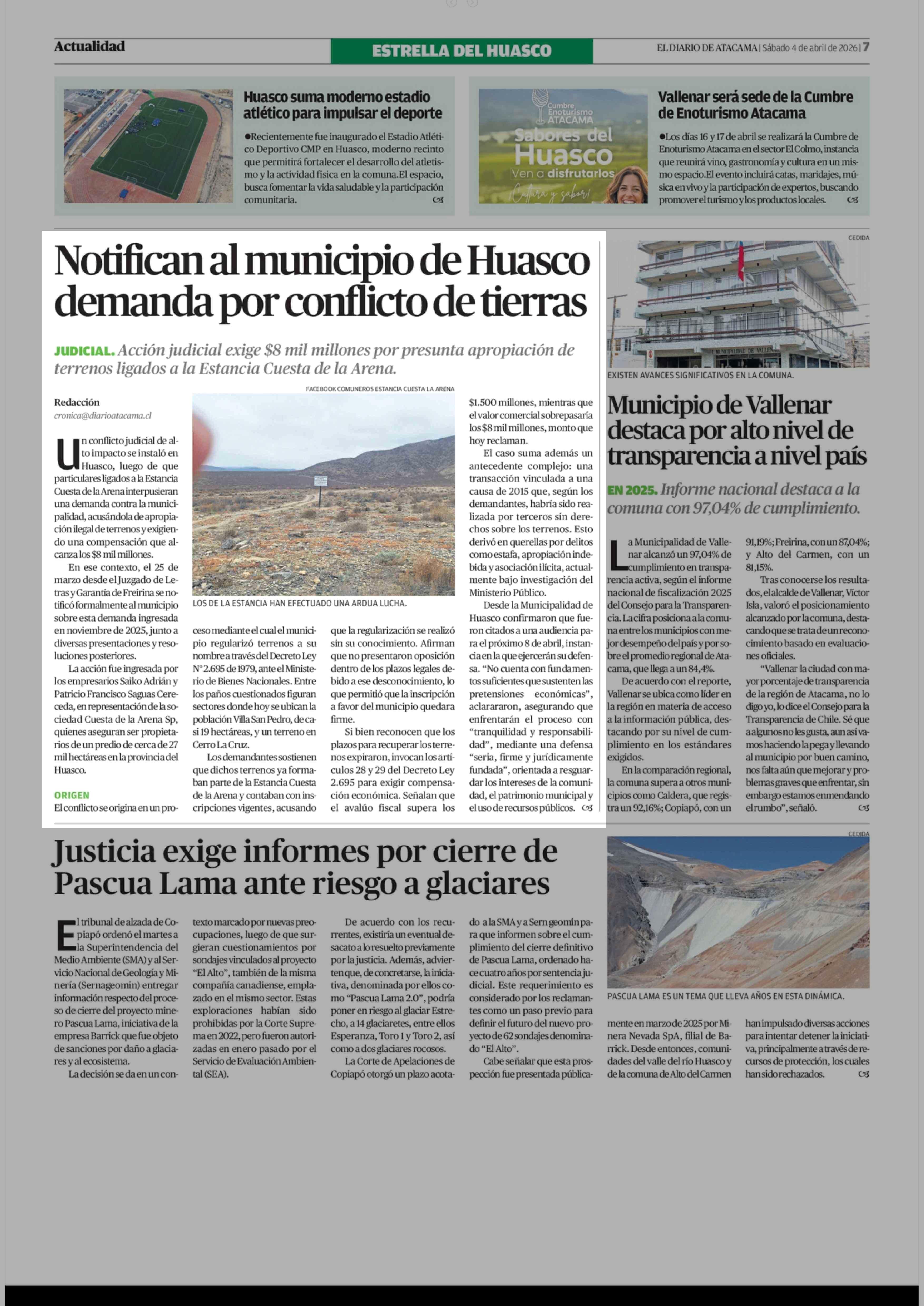 Notifican al municipio de Huasco demanda por conflicto de tierras 04-04-2026 El Diario de Atacama |