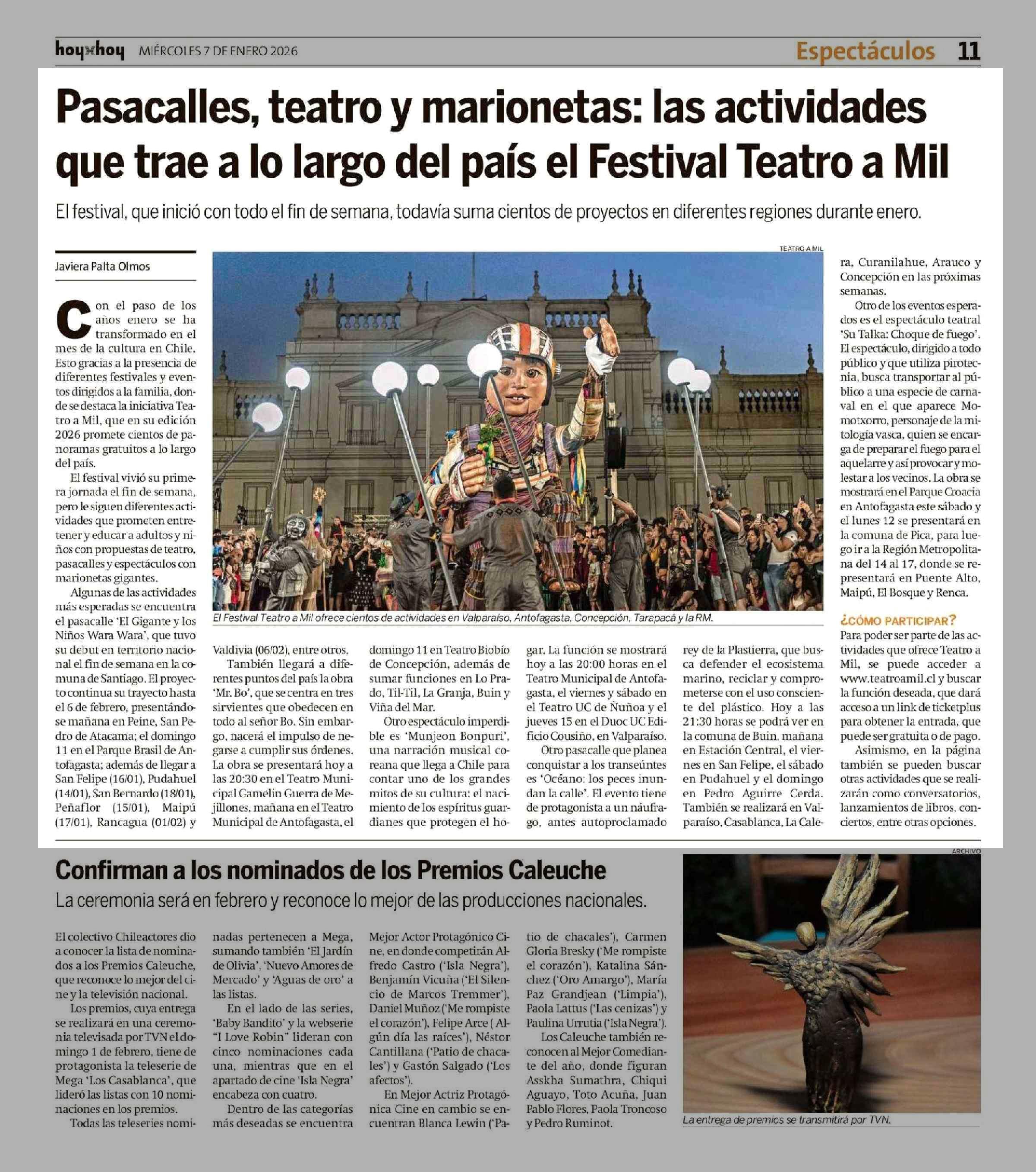Pasacalles, teatro y marionetas: las actividades que trae a lo largo del país el Festival Teatro a Mil 07-01-2026 Hoy x Hoy Antofagasta |