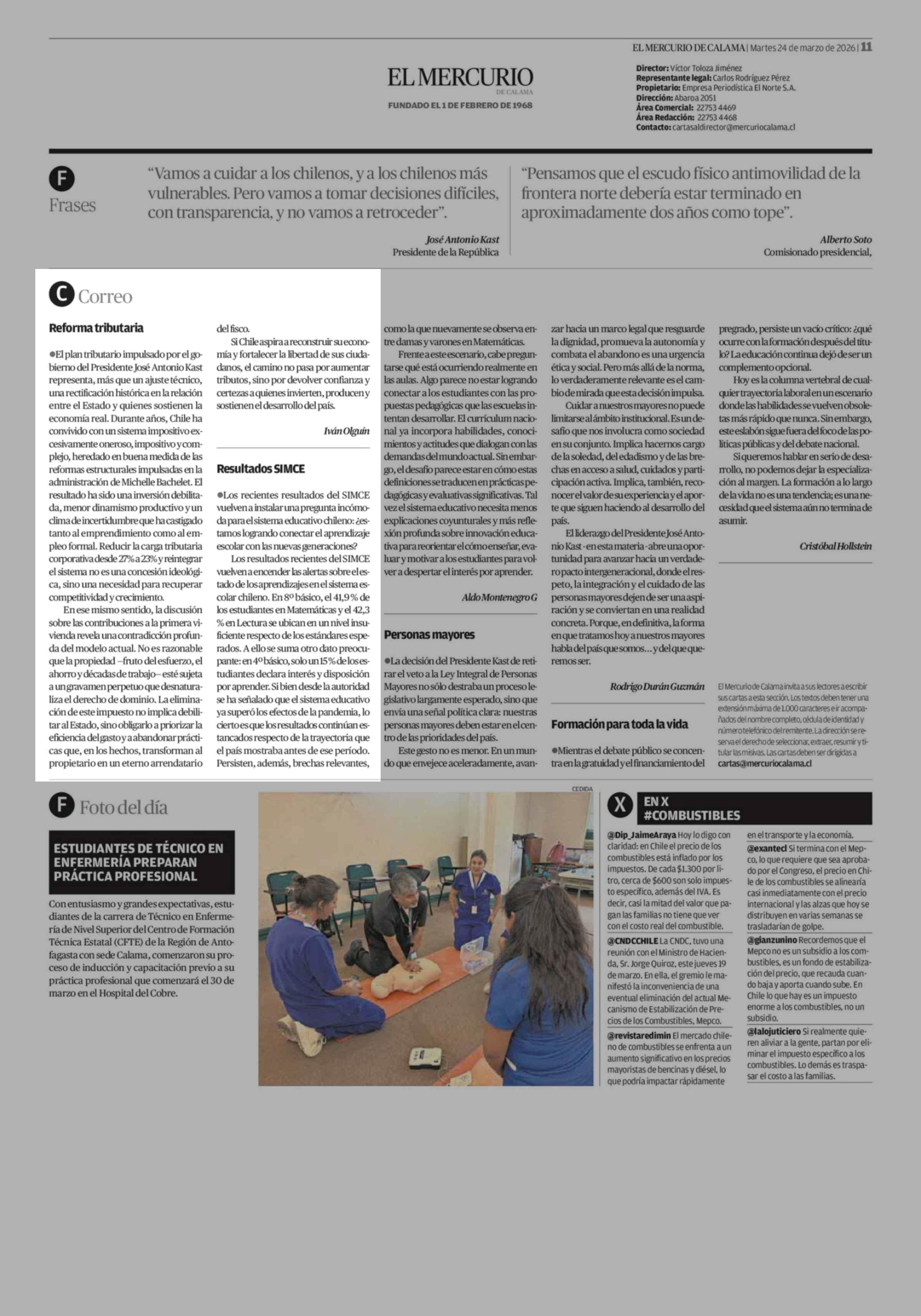Cartas: Reforma tributaria 24-03-2026 El Mercurio de Calama |