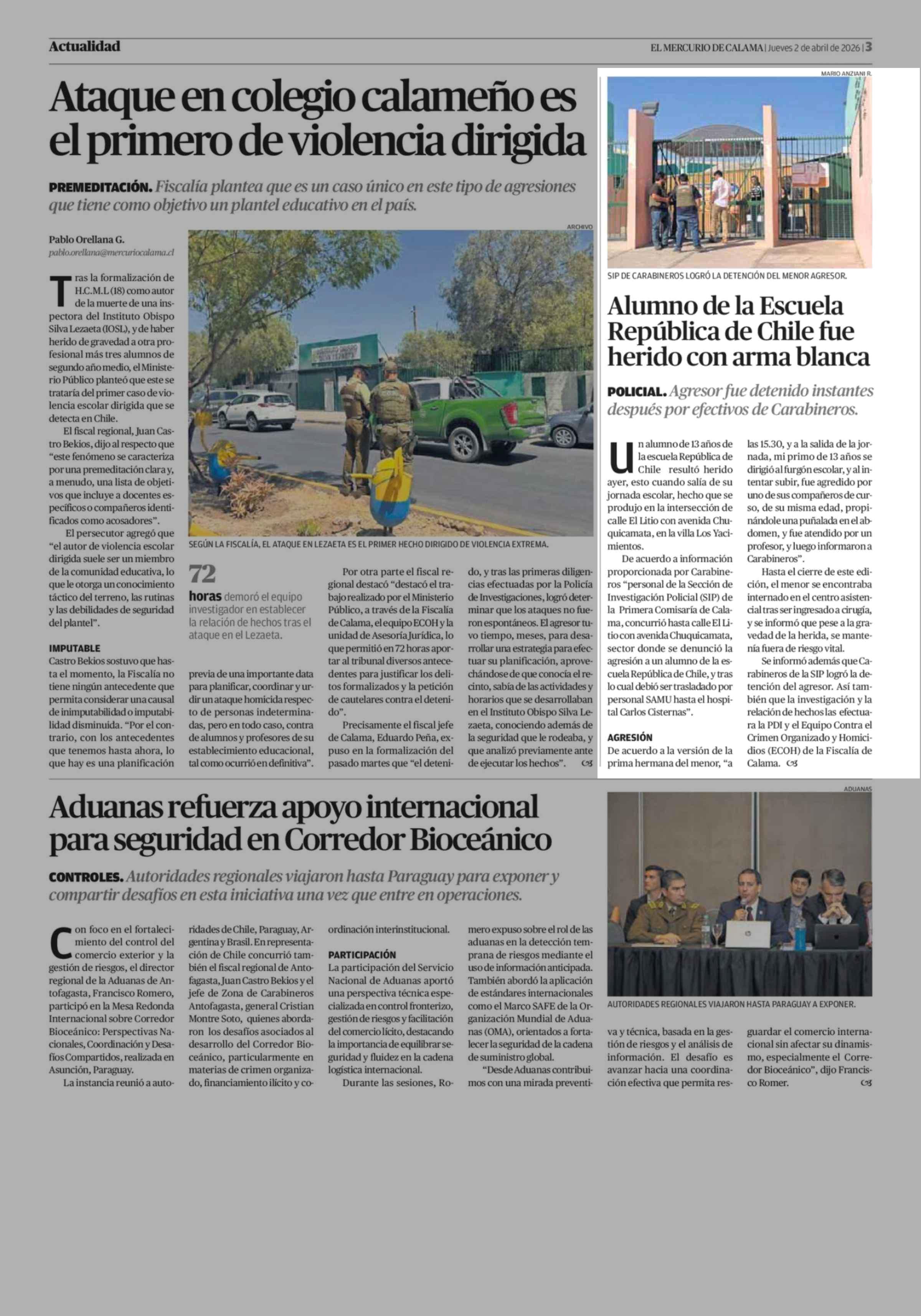 Alumno de la Escuela República de Chile fue herido con arma blanca 02-04-2026 El Mercurio de Calama |