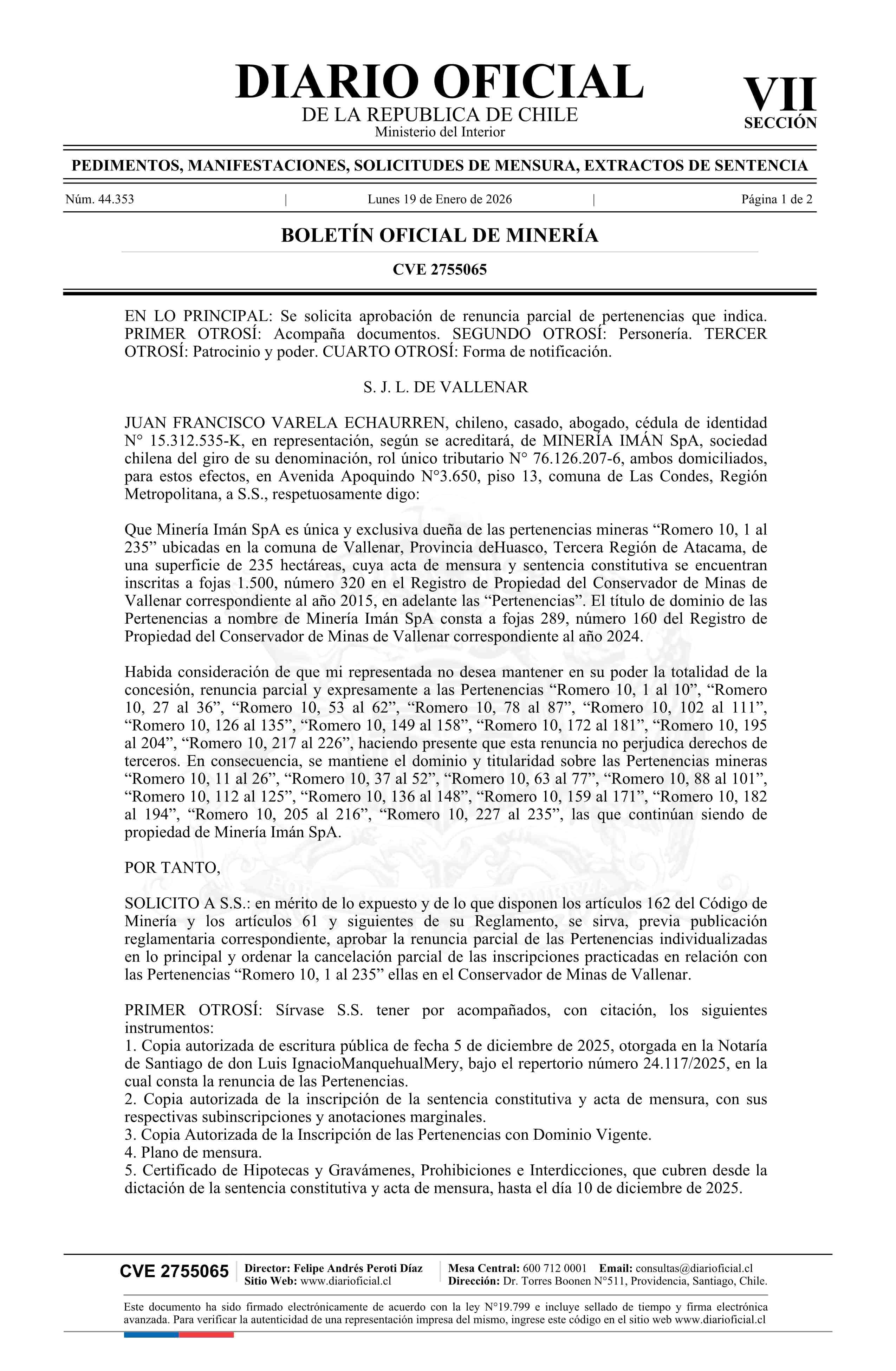 Romero 10, 1 al 10 y otras / Minería Imán SpA 19-01-2026 DIARIO OFICIAL CHILE - BOLETÍN OFICIAL DE MINERÍA |