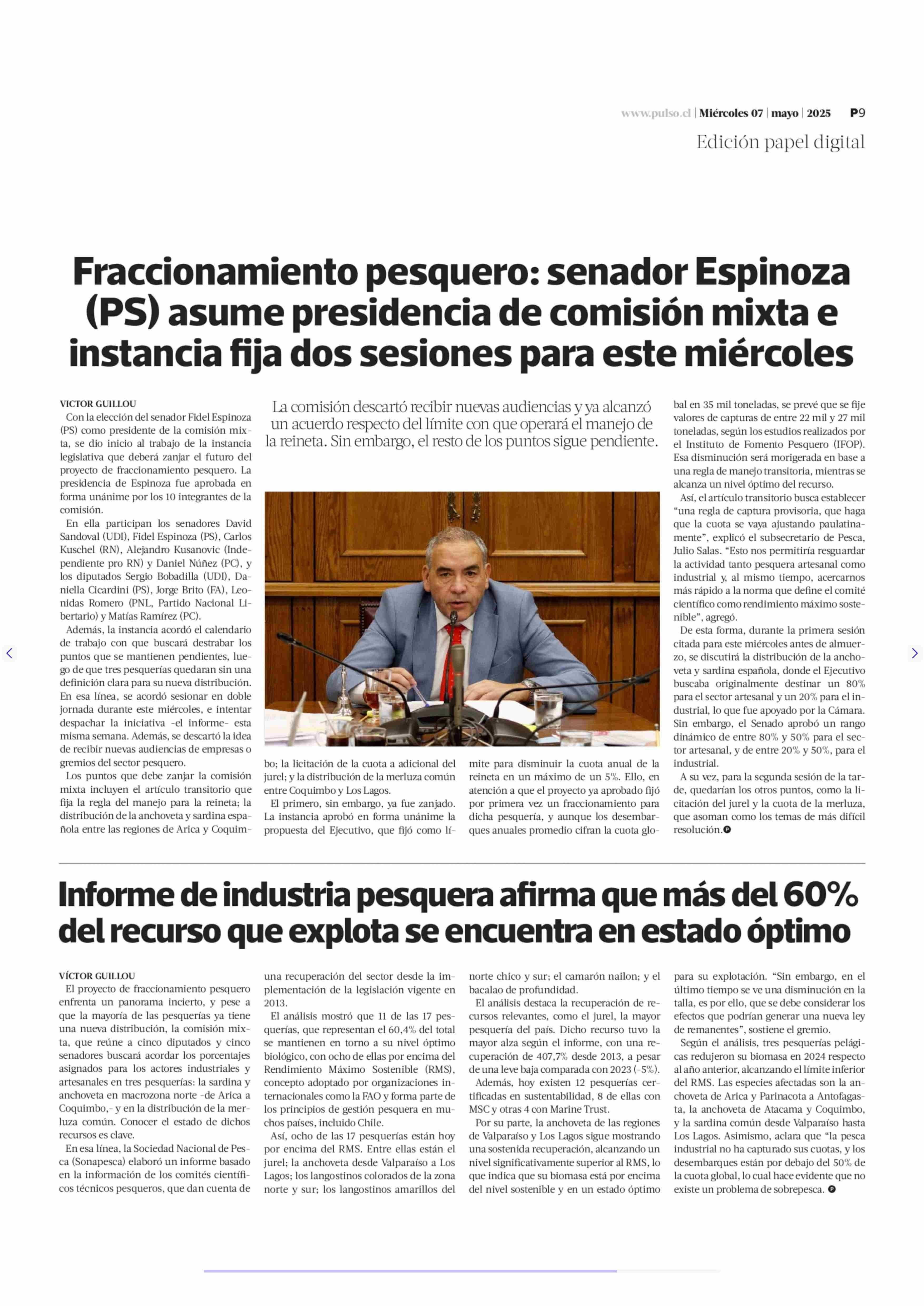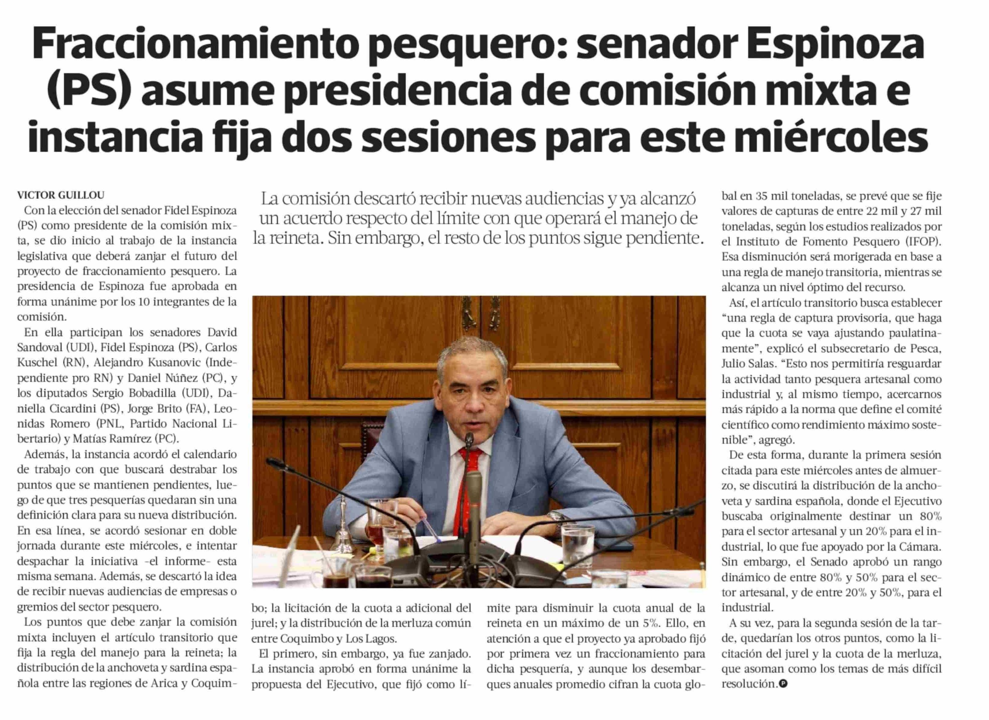 Fraccionamiento pesquero: senador Espinoza (PS) asume presidencia de comisión mixta e instancia fija dos sesiones para este miércoles 07-05-2025 La Tercera |