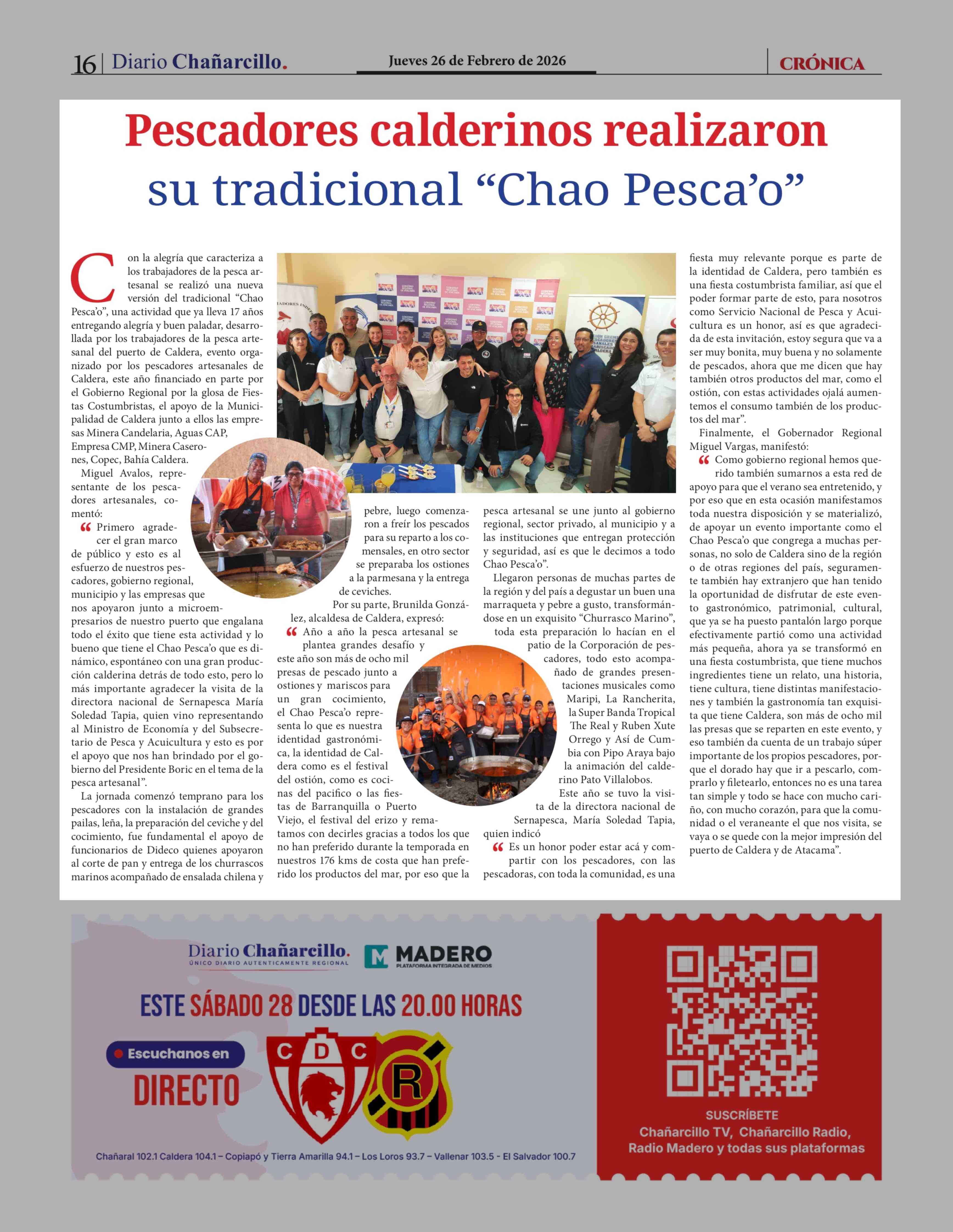 Pescadores calderinos realizaron su tradicional "Chao Pesca'o" 26-02-2026 Diario Chañarcillo |