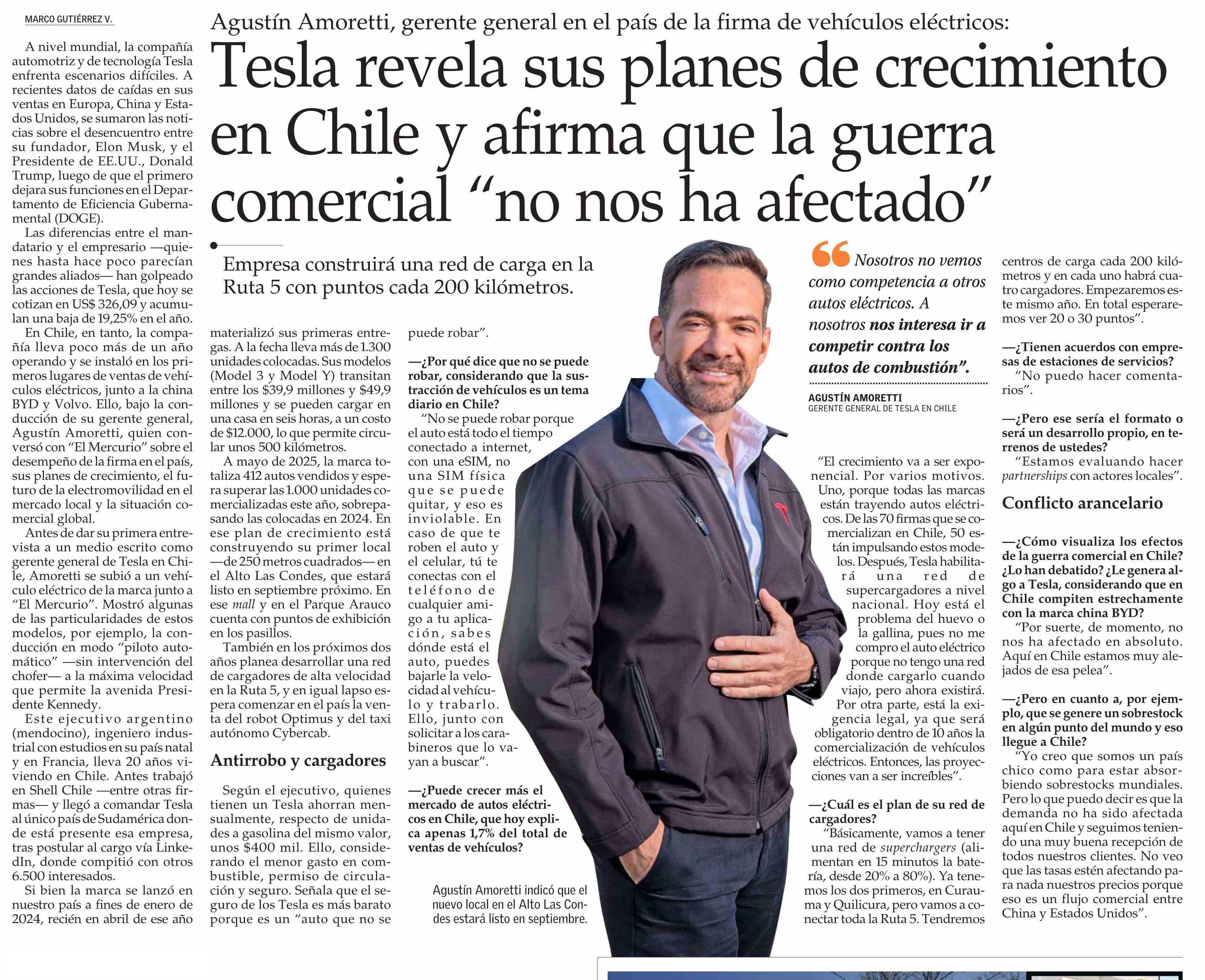 Tesla revela sus planes de crecimiento en Chile y afirma que la guerra comercial “no nos ha afectado” 11-06-2025 El Mercurio |