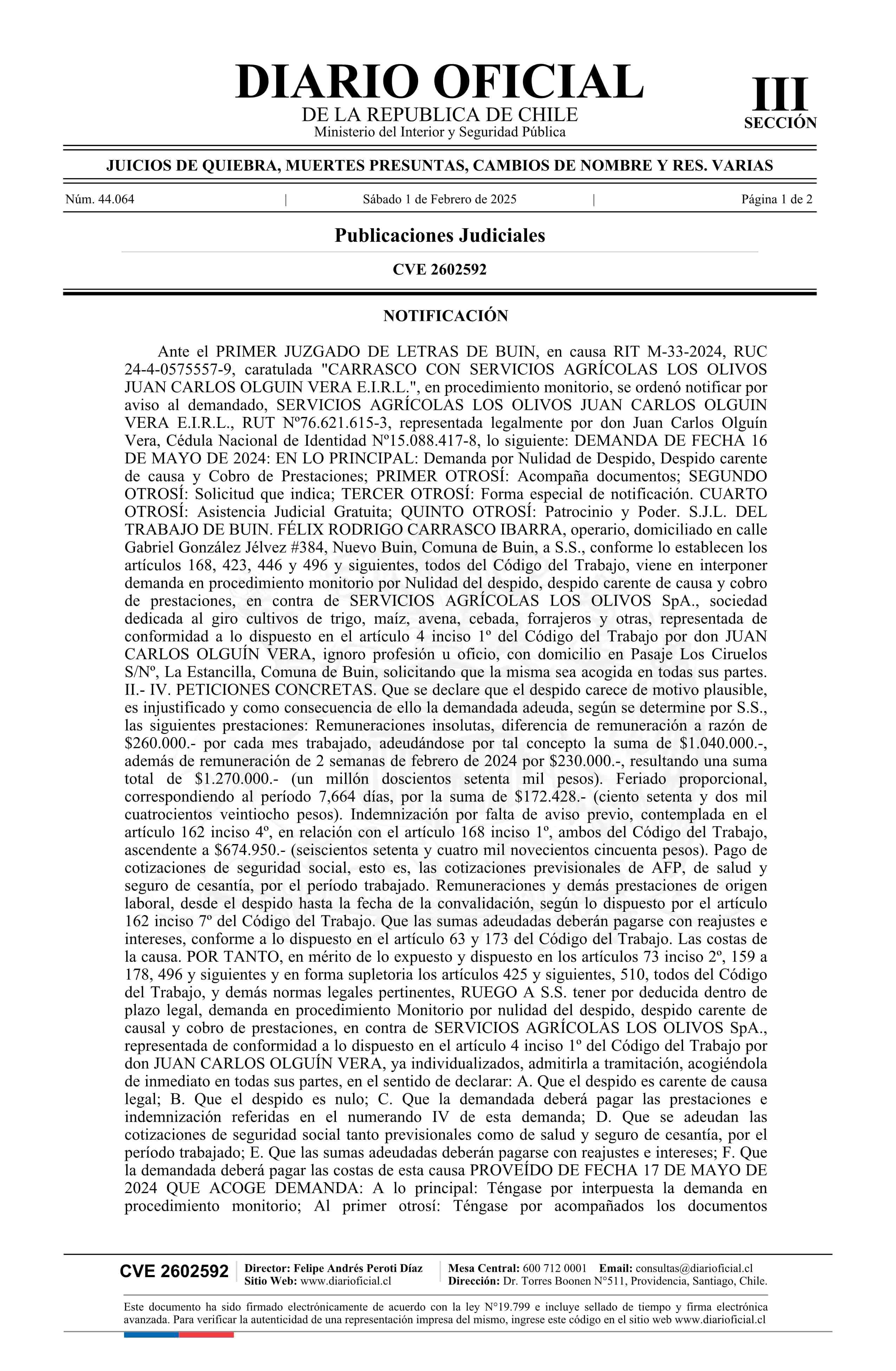 Carrasco - Servicios Agrícolas Los Olivos Juan Carlos Olguín Vera E.I.R.L. 01-02-2025 Diario Oficial Edición Electrónica |