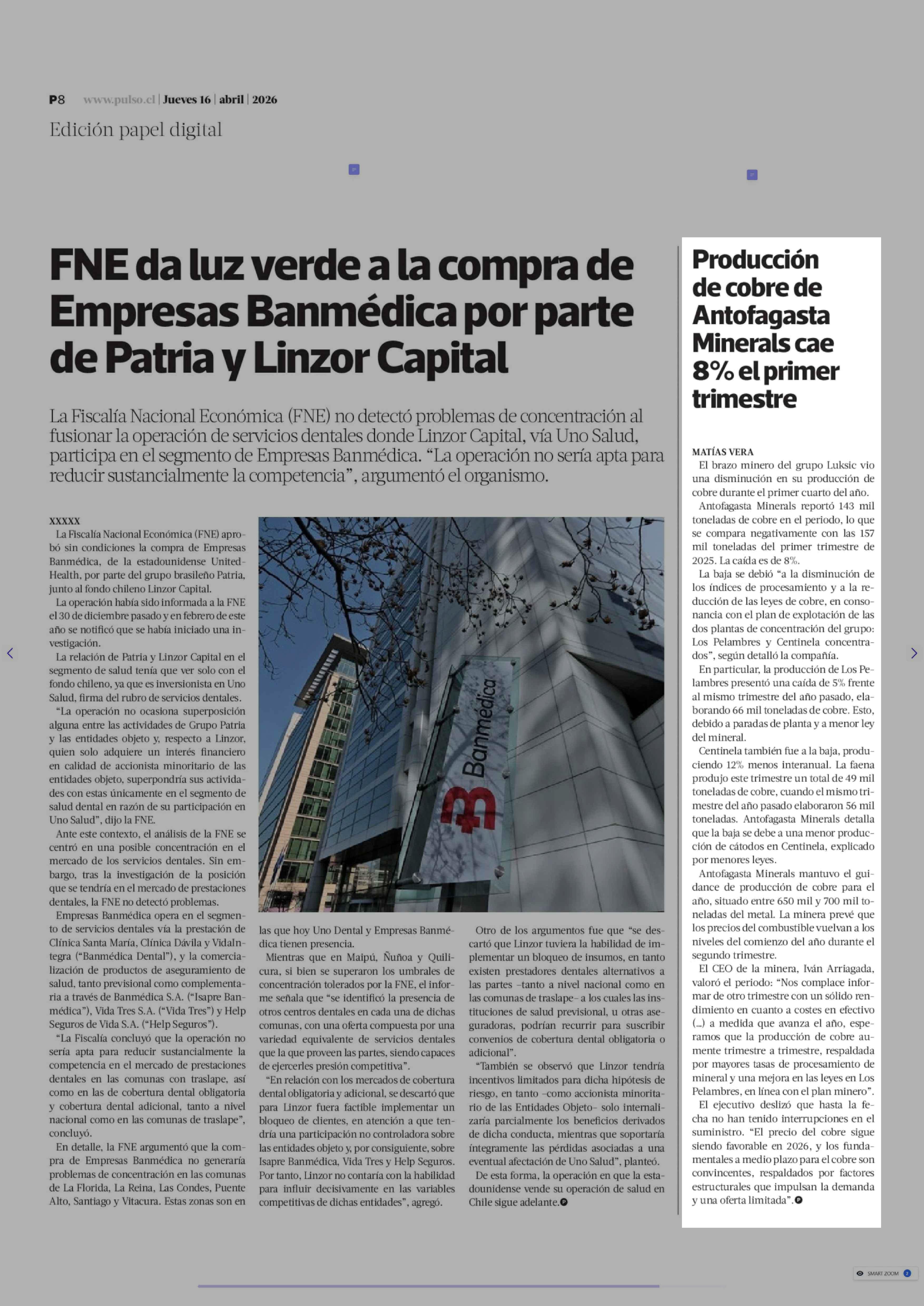Producción de cobre de Antofagasta Minerals cae 8% el primer trimestre 16-04-2026 La Tercera |