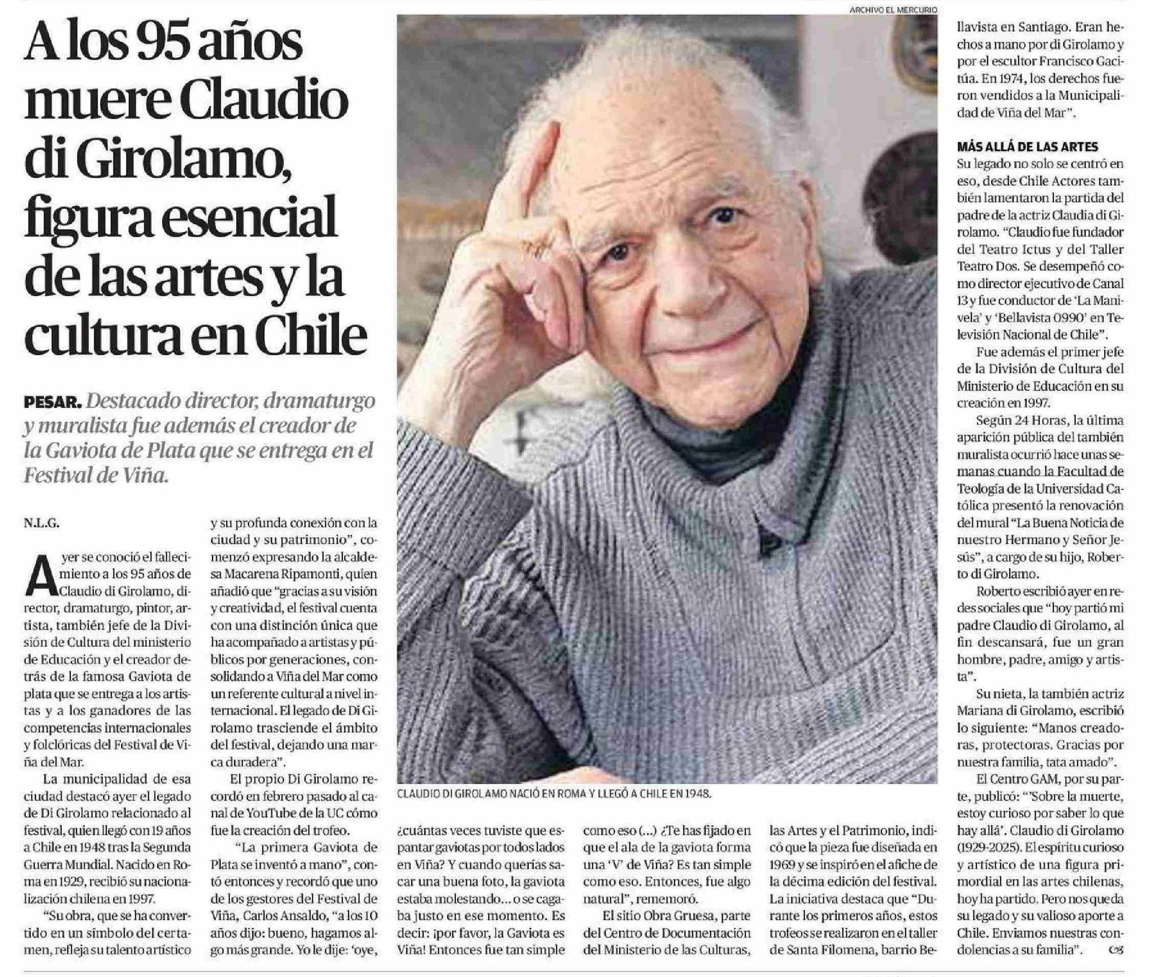 A los 95 años muere Claudio di Girolamo, figura esencial de las artes y la cultura en Chile 23-05-2025 El Mercurio de Calama |