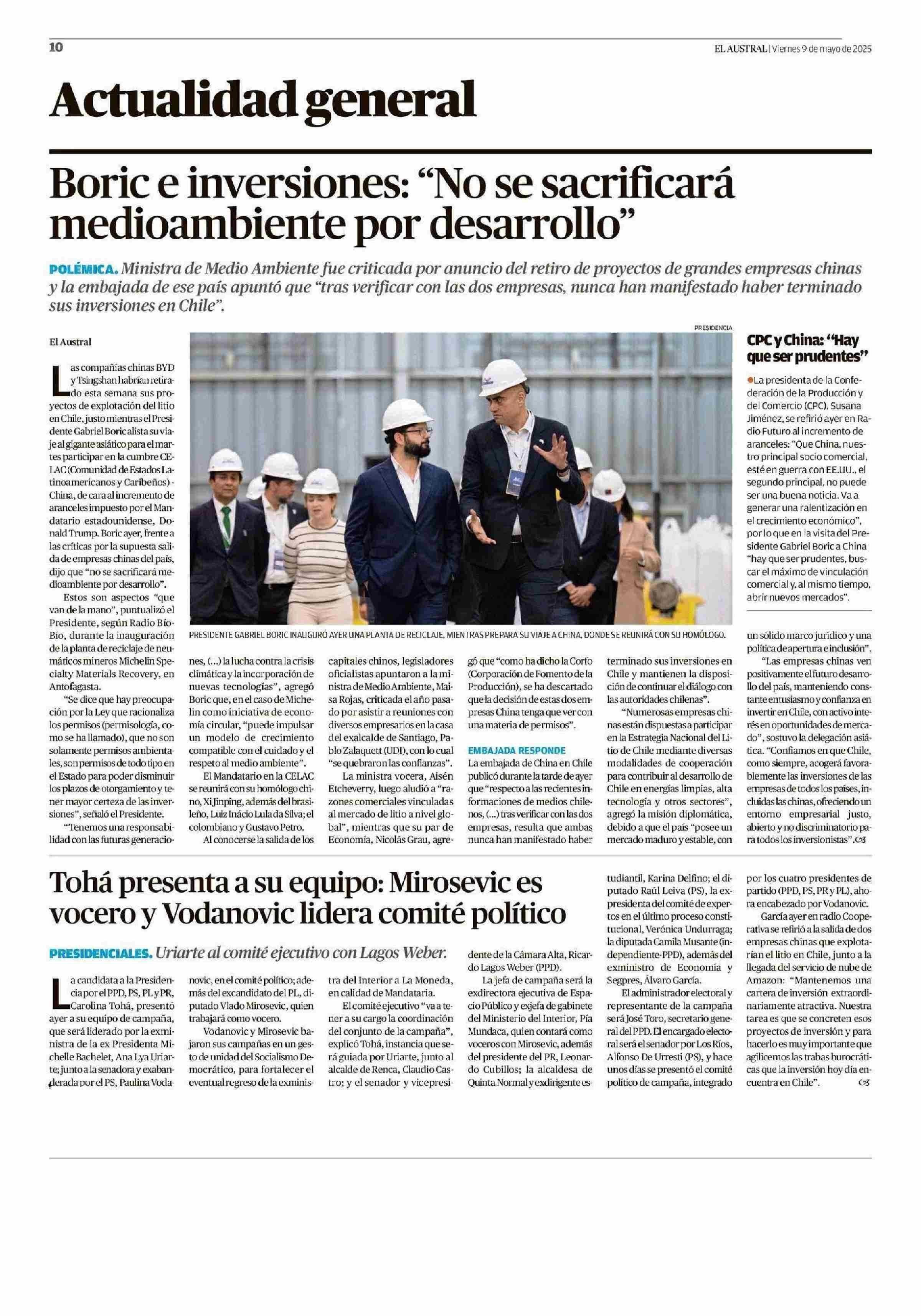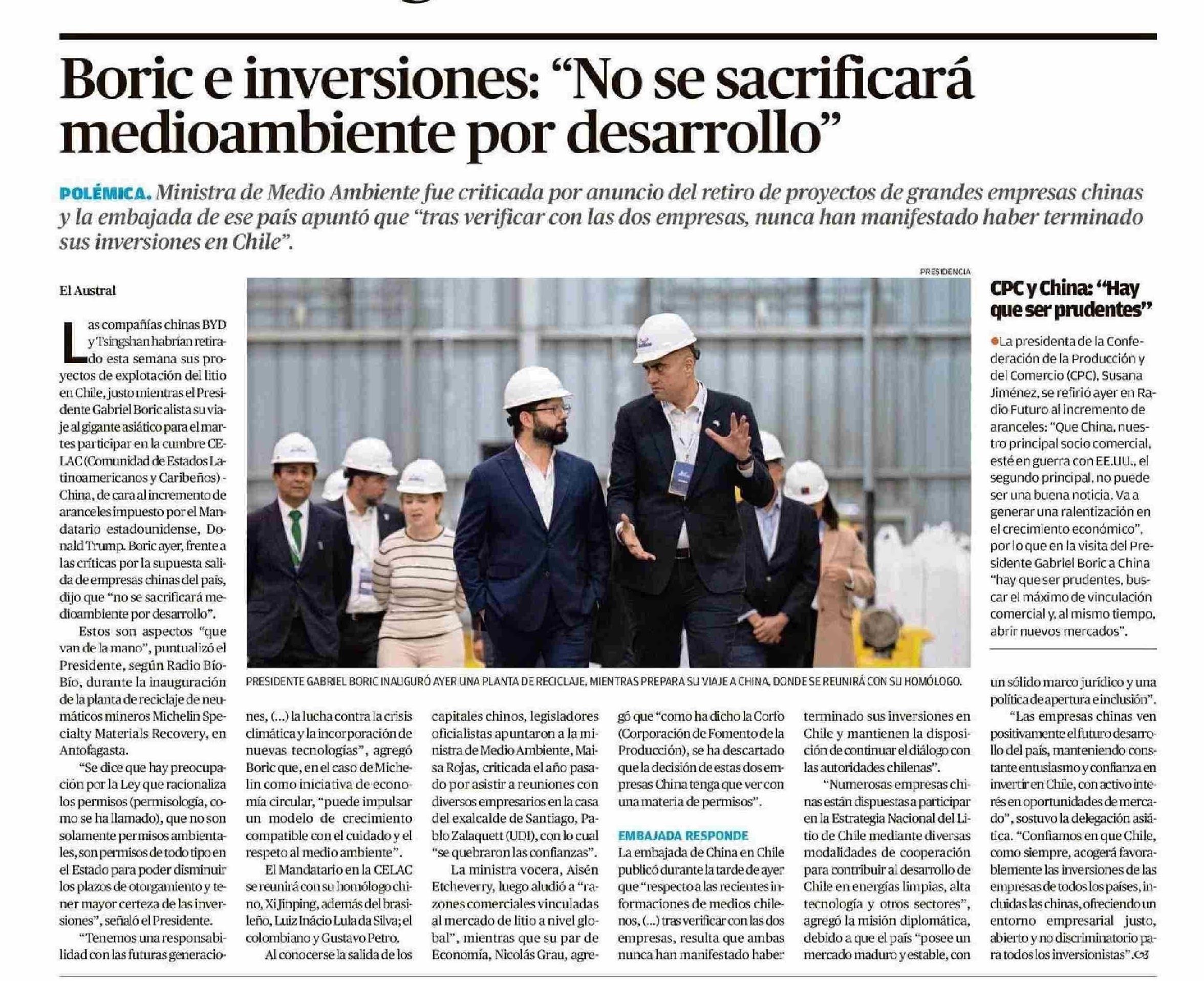 Boric e inversiones: “No se sacrificará medioambiente por desarrollo” 09-05-2025 El Austral de la Araucanía |