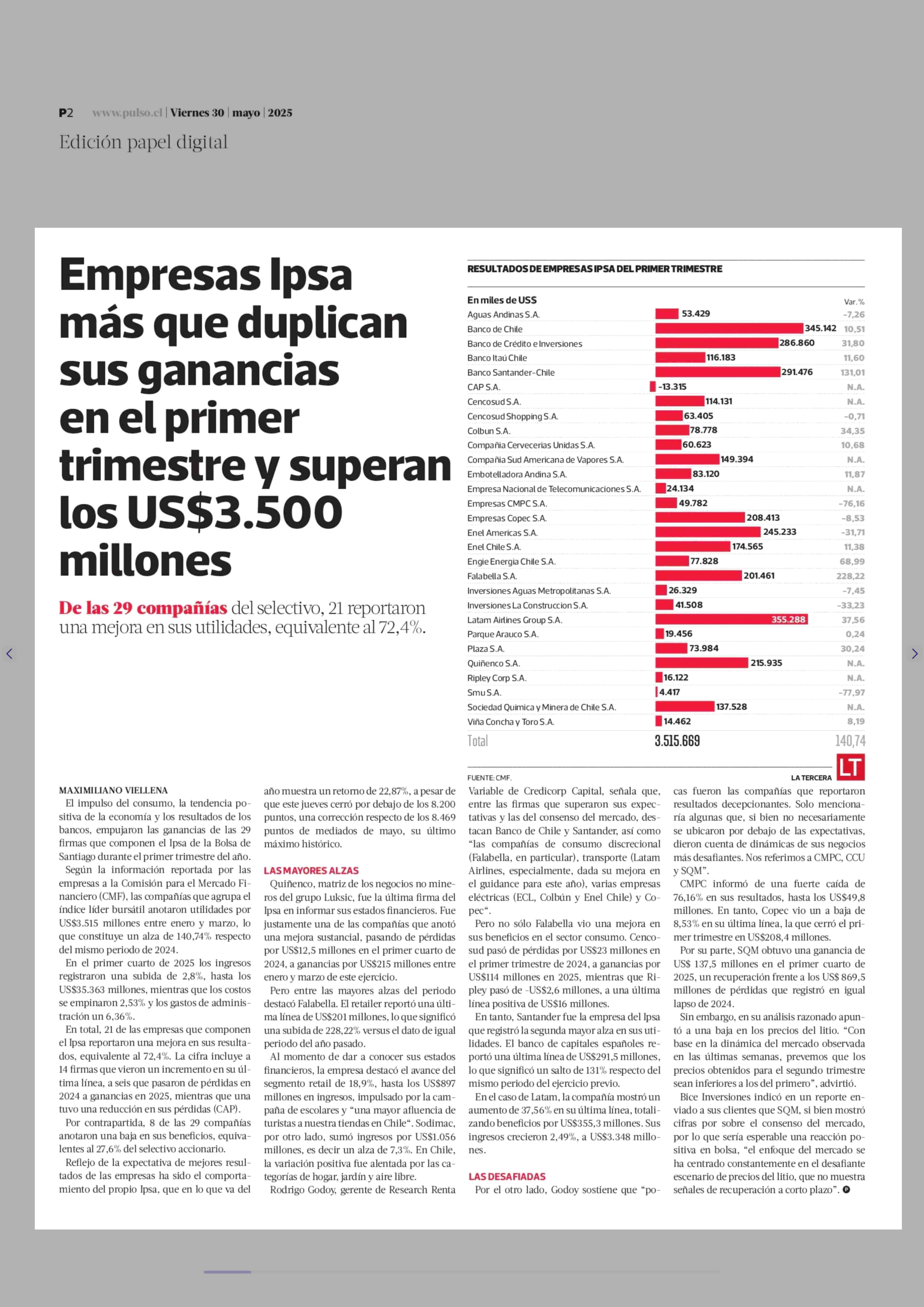 Empresas Ipsa más que duplican sus ganancias en el primer trimestre y superan los US$3.500 millones 30-05-2025 La Tercera |