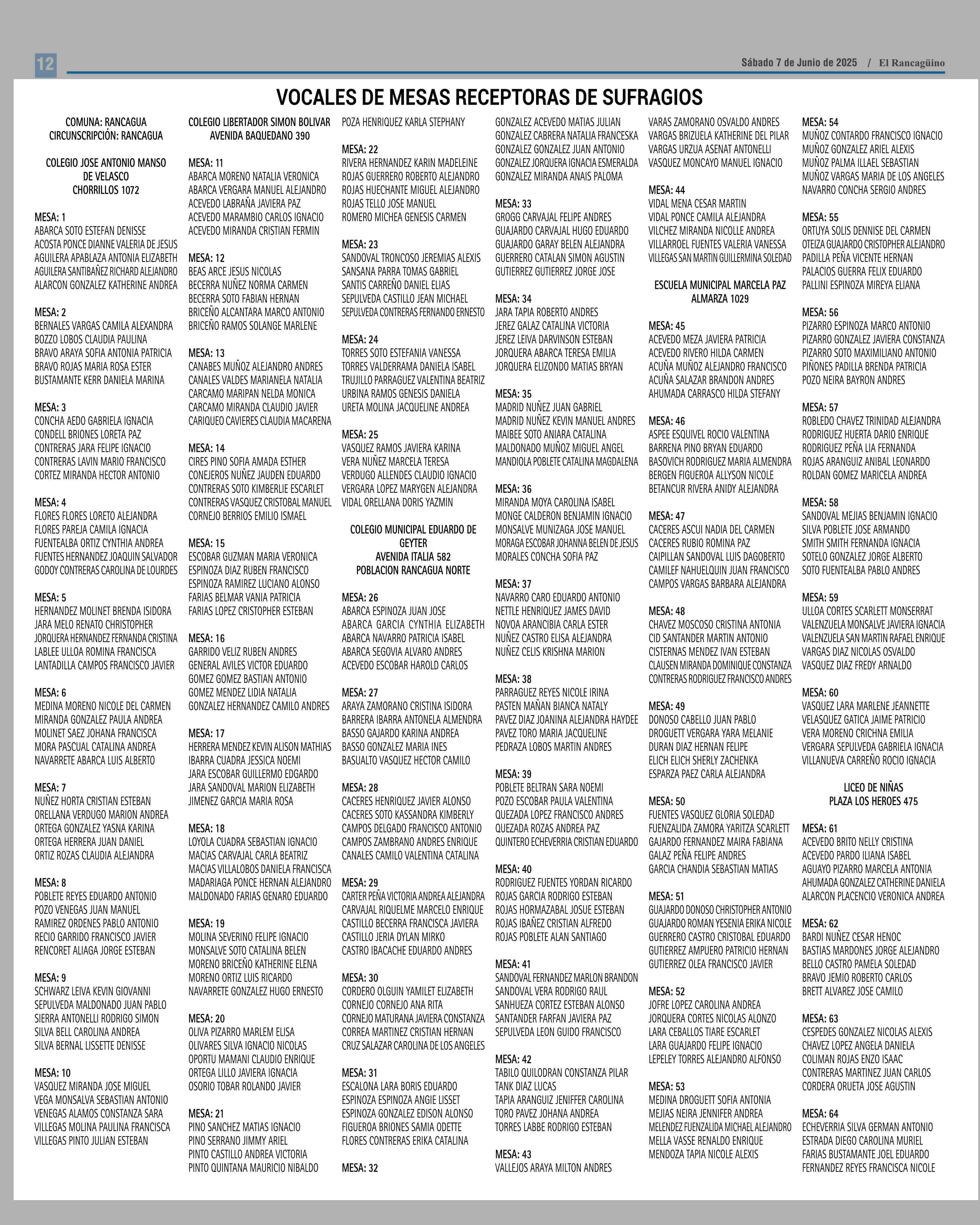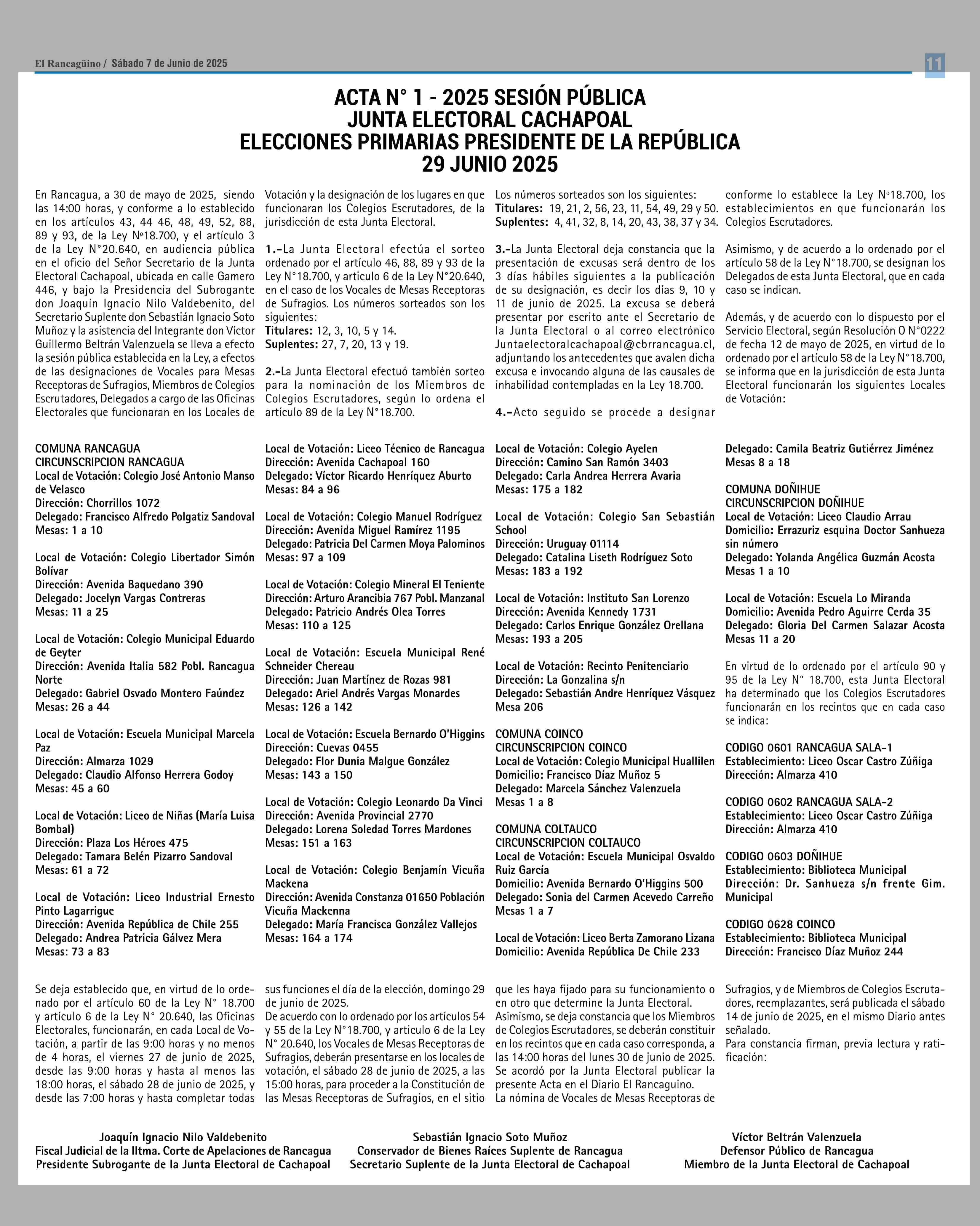 EXTRACTOS: ACTA N” 1 2025 SESION PUBLICA JUNTA ELECTORAL CACHAPOAL ) ELECCIONES PRIMARIAS PRESIDENTE DE LA REPUBLICA 29 JUNIO 2025 07-06-2025 El Rancagüino |