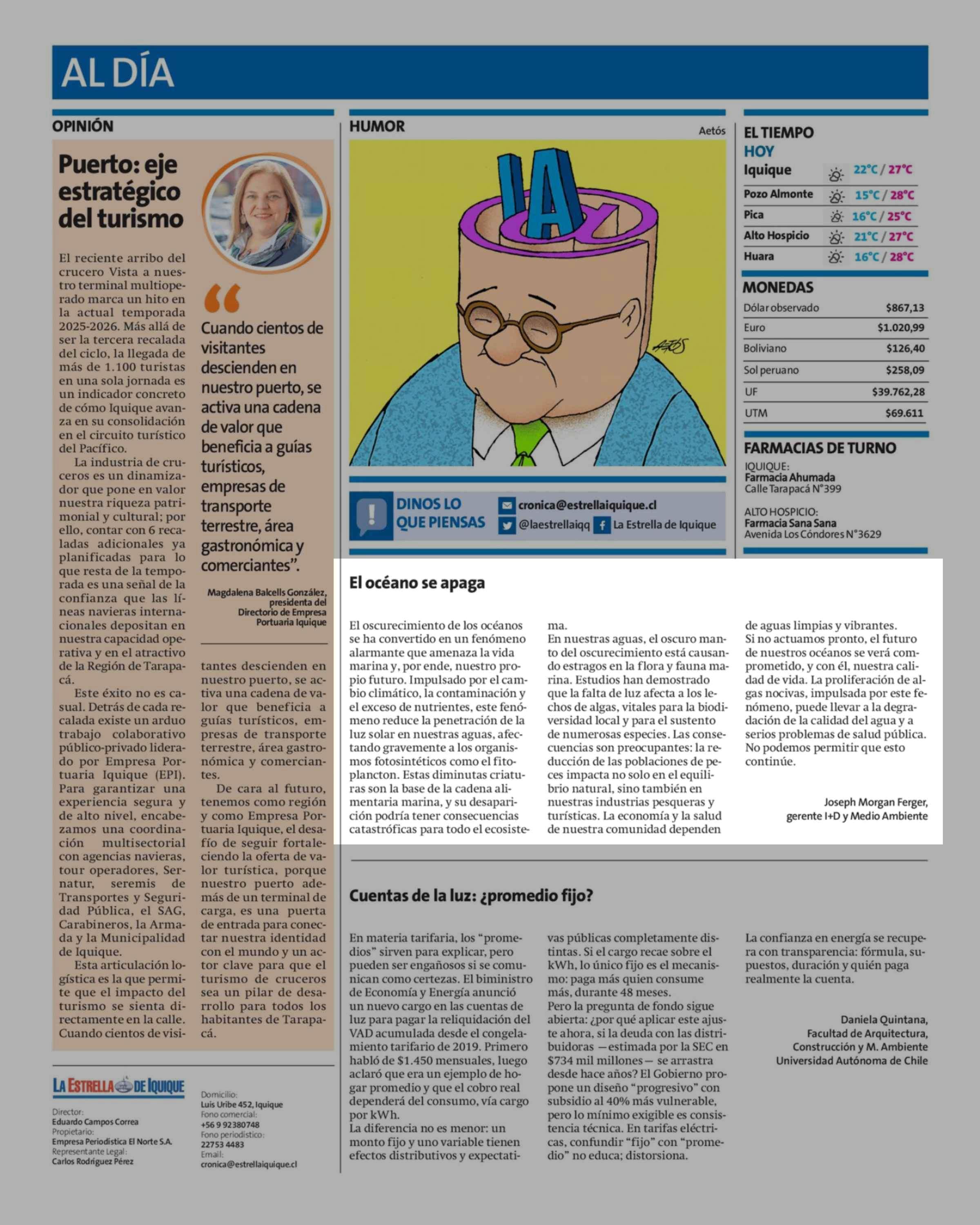 Cartas: El océano se apaga 23-02-2026 La Estrella de Iquique |