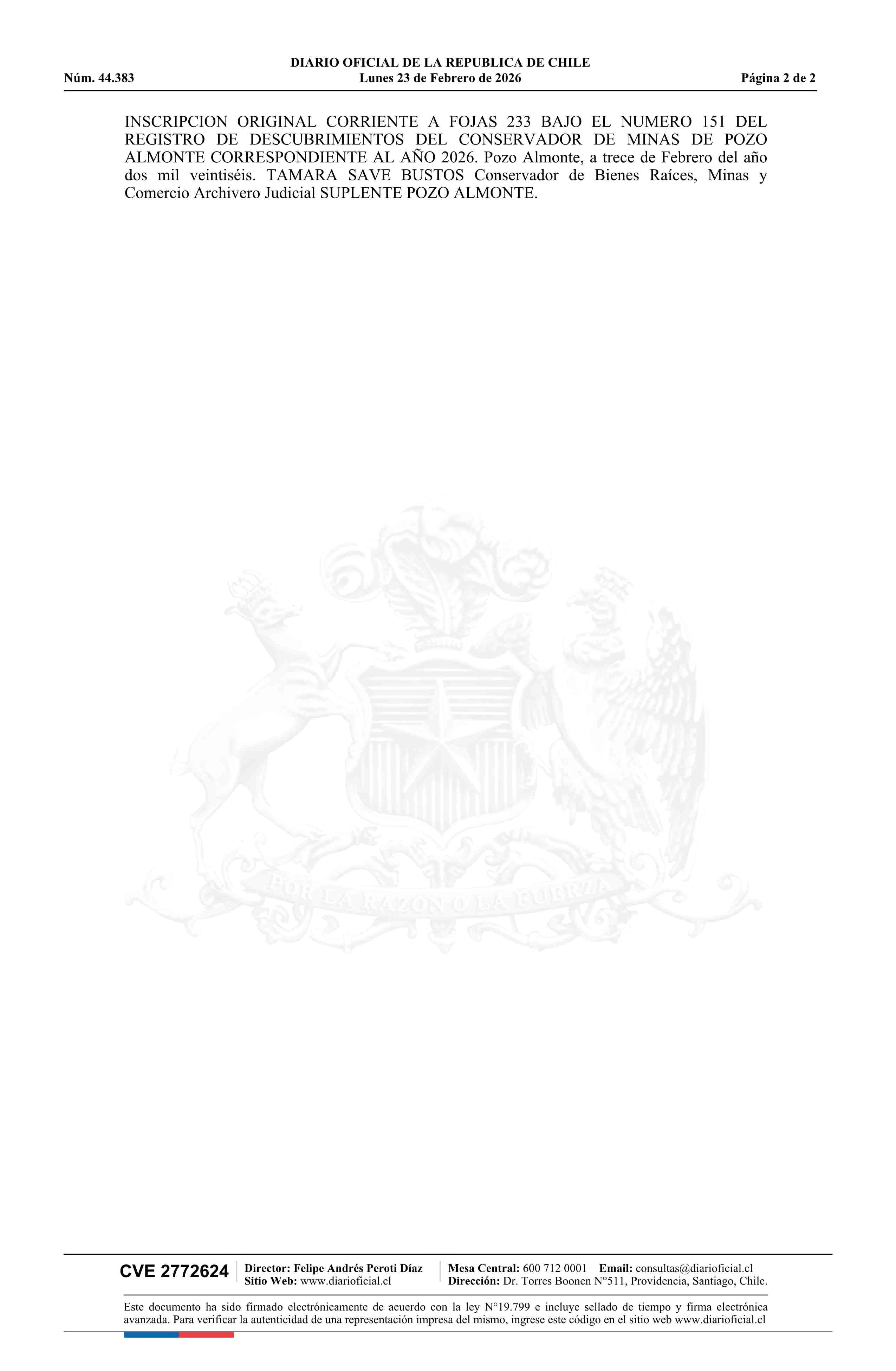 COYA / Teck Resources Chile Limitada 23-02-2026 DIARIO OFICIAL CHILE - BOLETÍN OFICIAL DE MINERÍA |