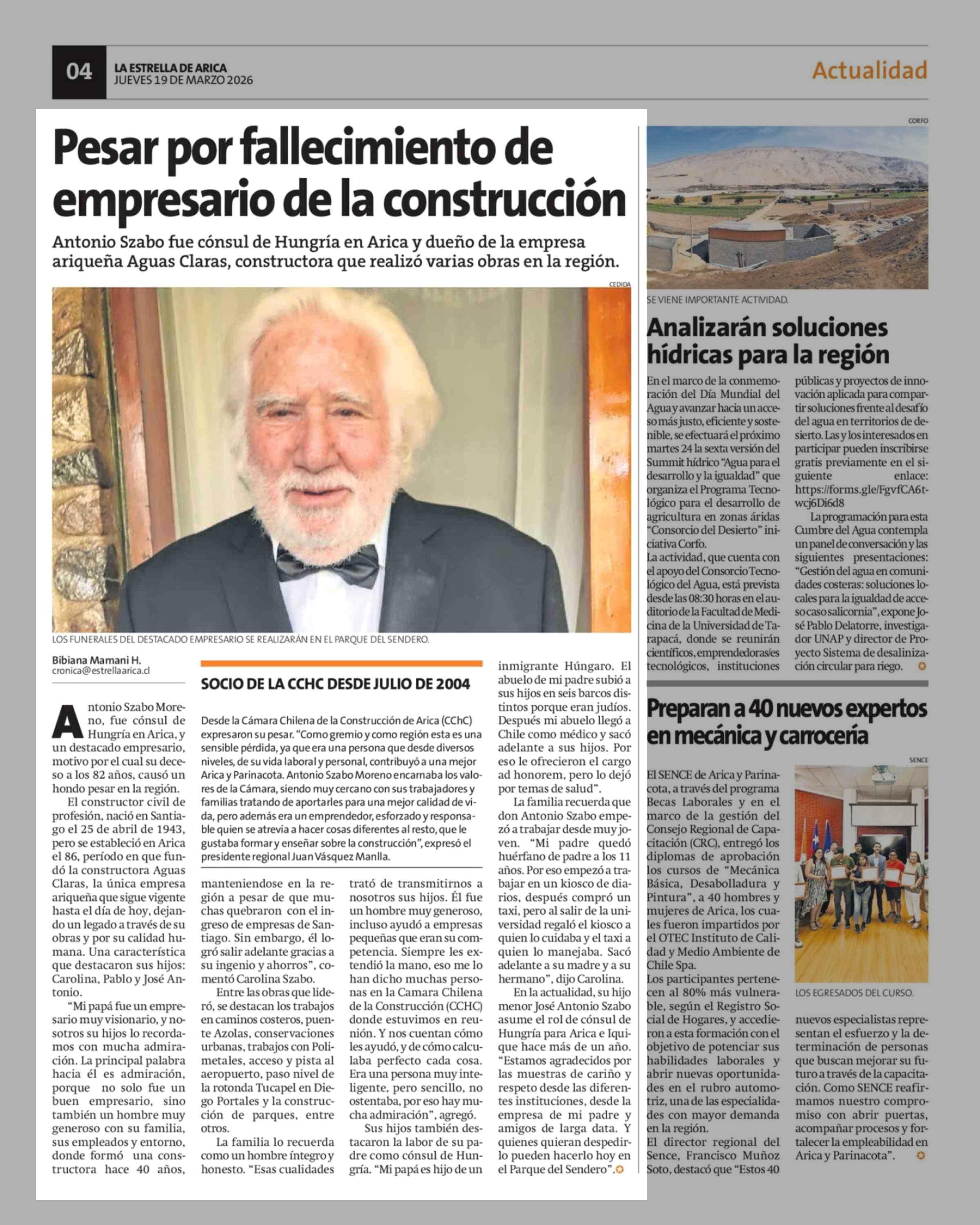 Pesar por fallecimiento de empresario de la construcción 19-03-2026 La Estrella de Arica |
