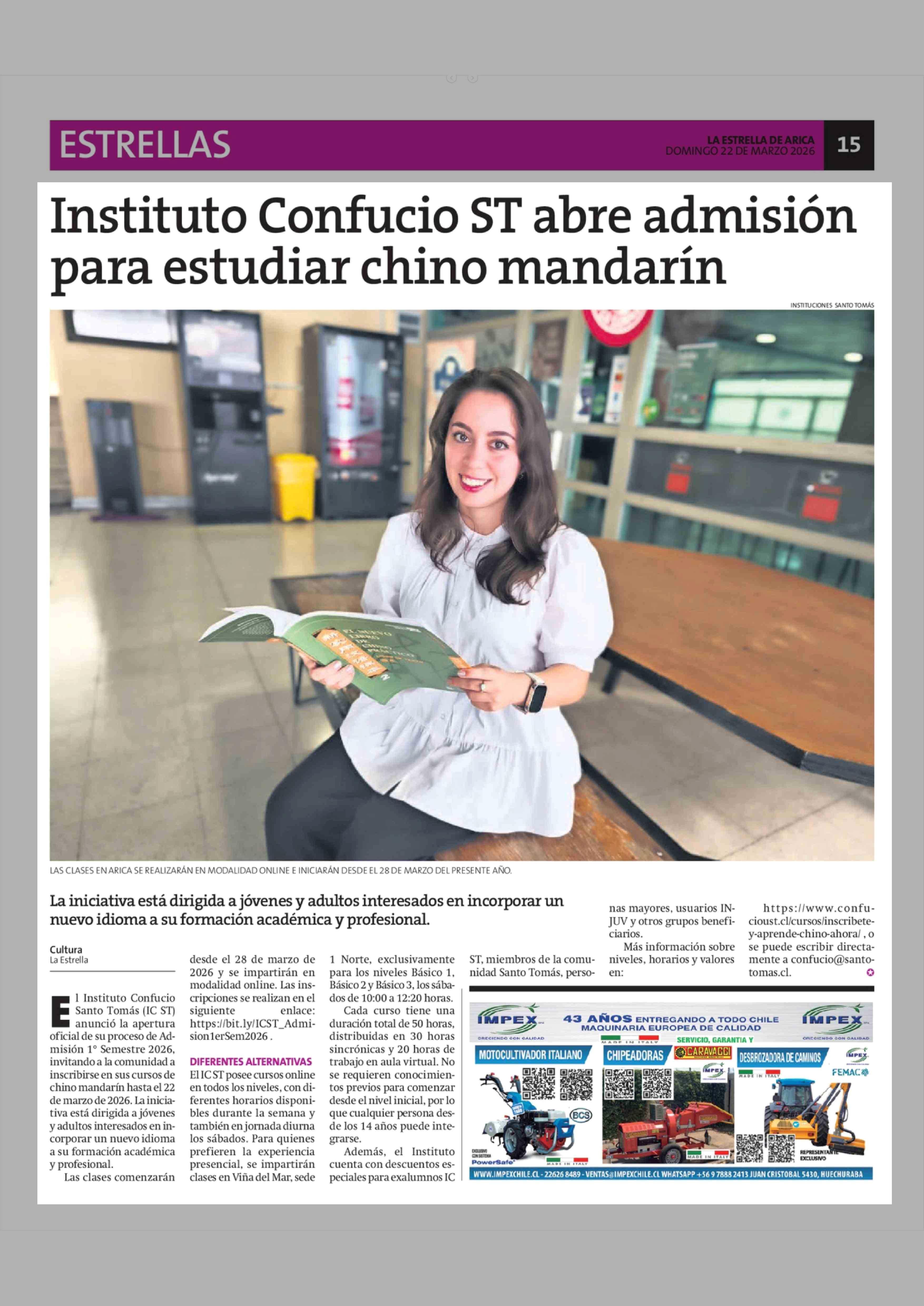 Instituto Confucio ST abre admisión para estudiar chino mandarín 22-03-2026 La Estrella de Arica |