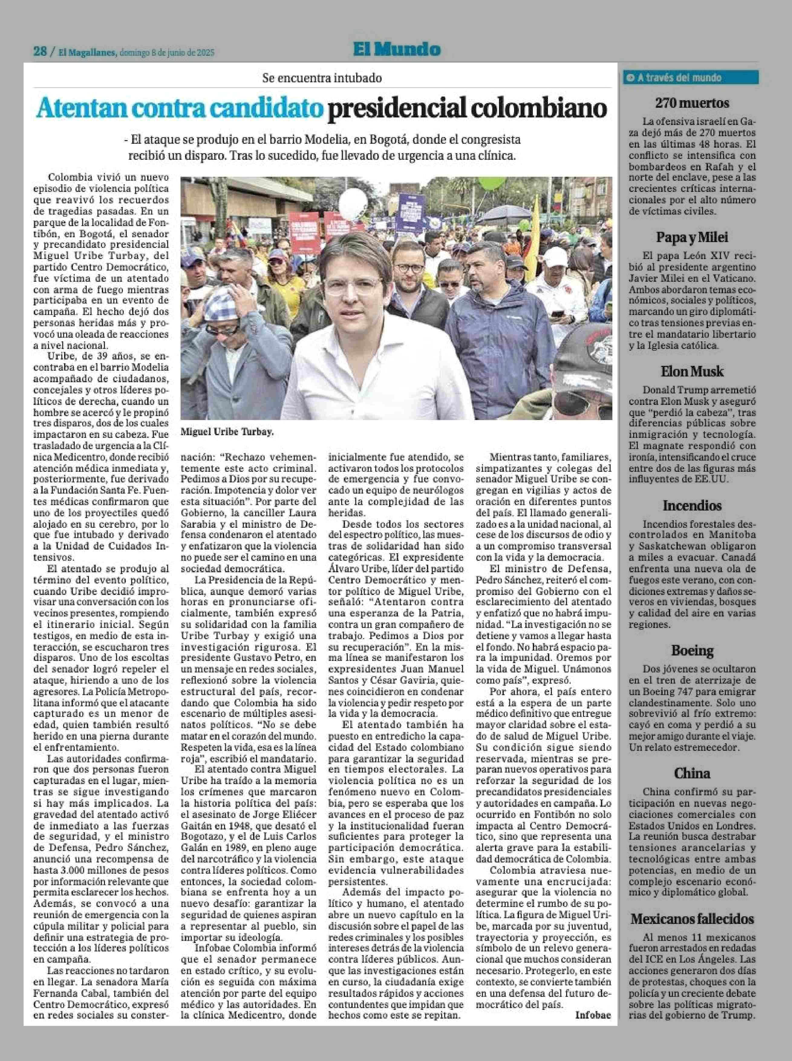 Atentan contra candidato presidencial colombiano 08-06-2025 El Magallanes |