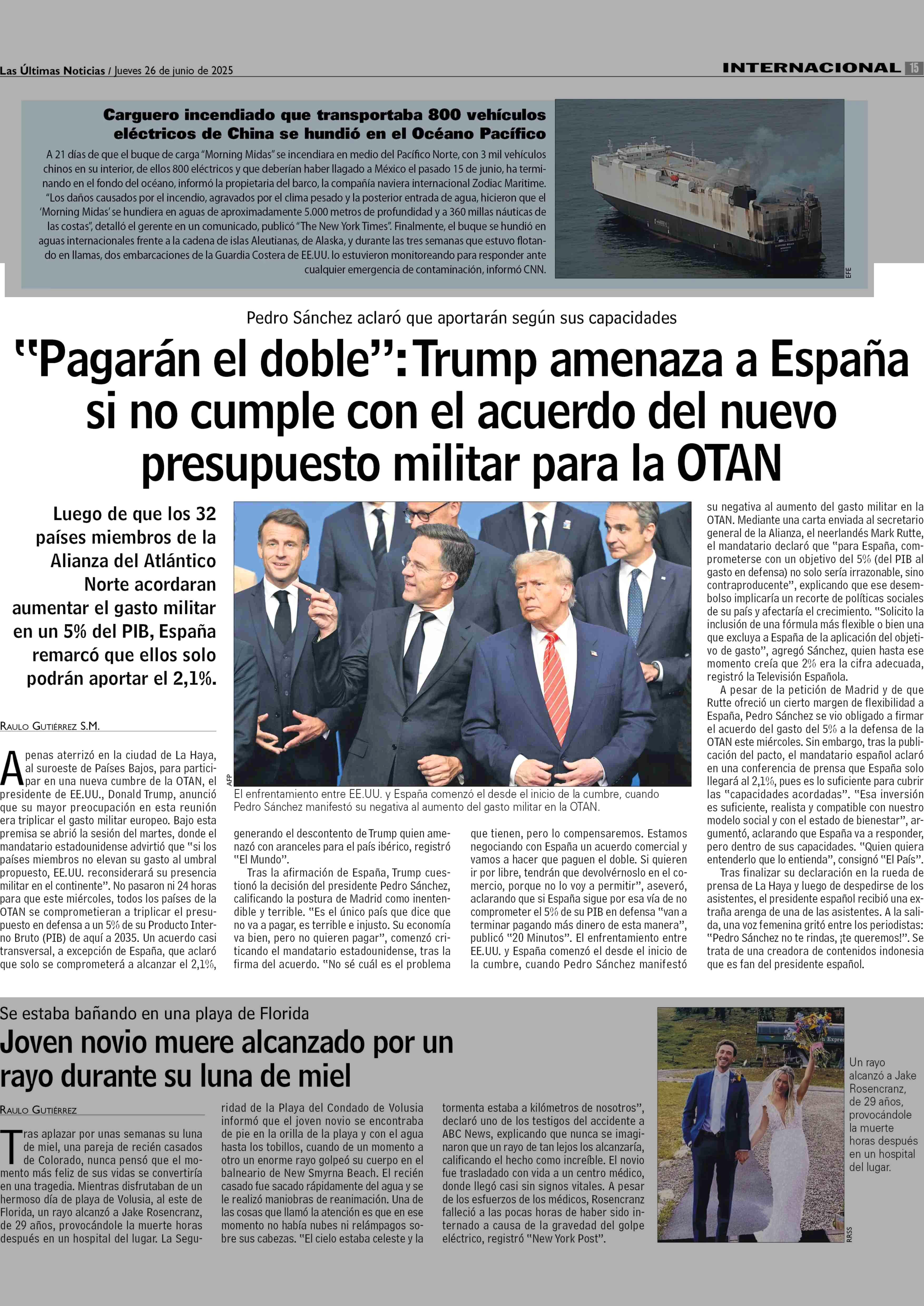 “Pagarán el doble”: Trump amenaza a España si no cumple con el acuerdo del nuevo presupuesto militar para la OTAN 26-06-2025 Las Últimas Noticias |