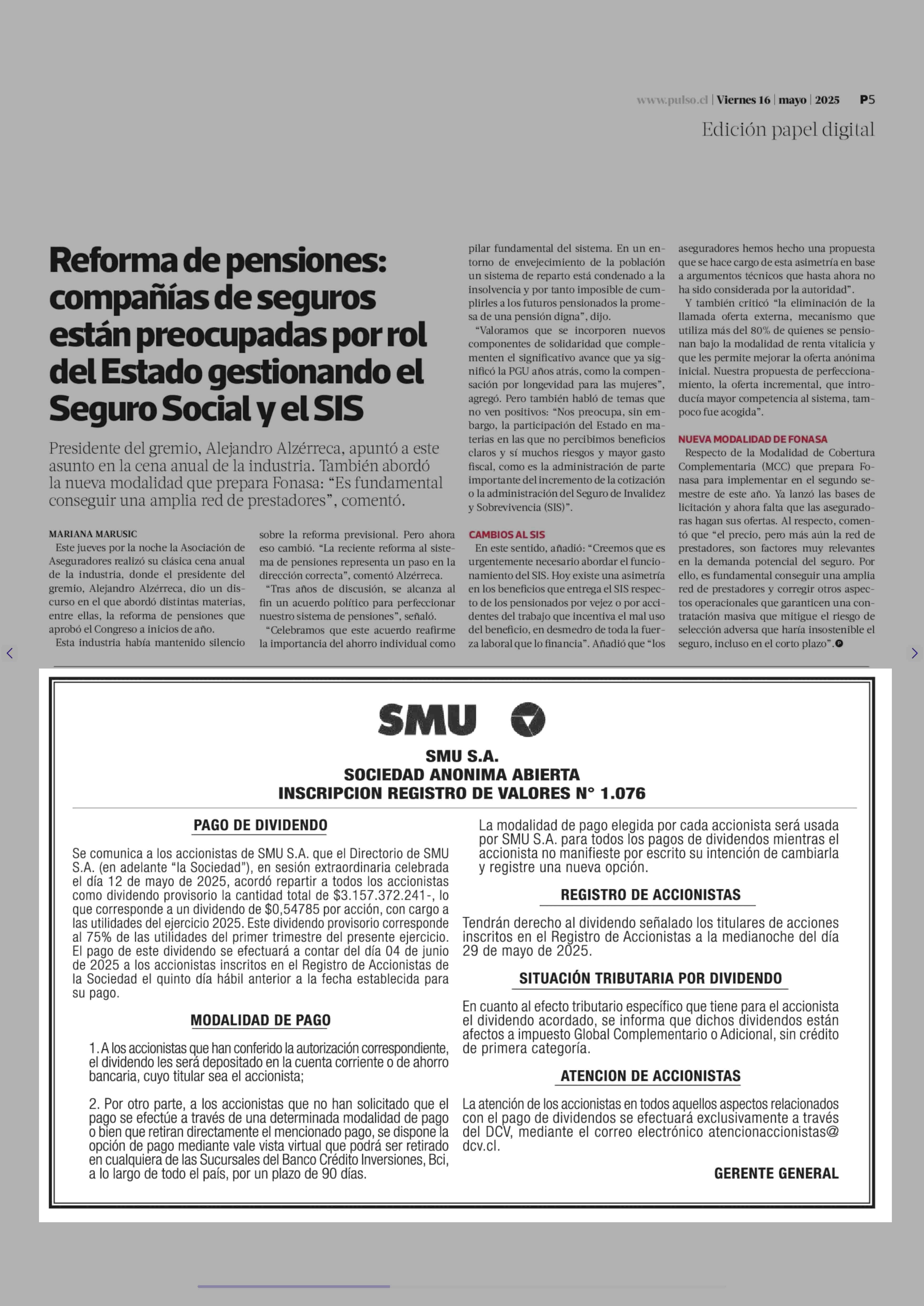 EXTRACTOS: SMU S.A. SOCIEDAD ANONIMA ABIERTA 16-05-2025 La Tercera |