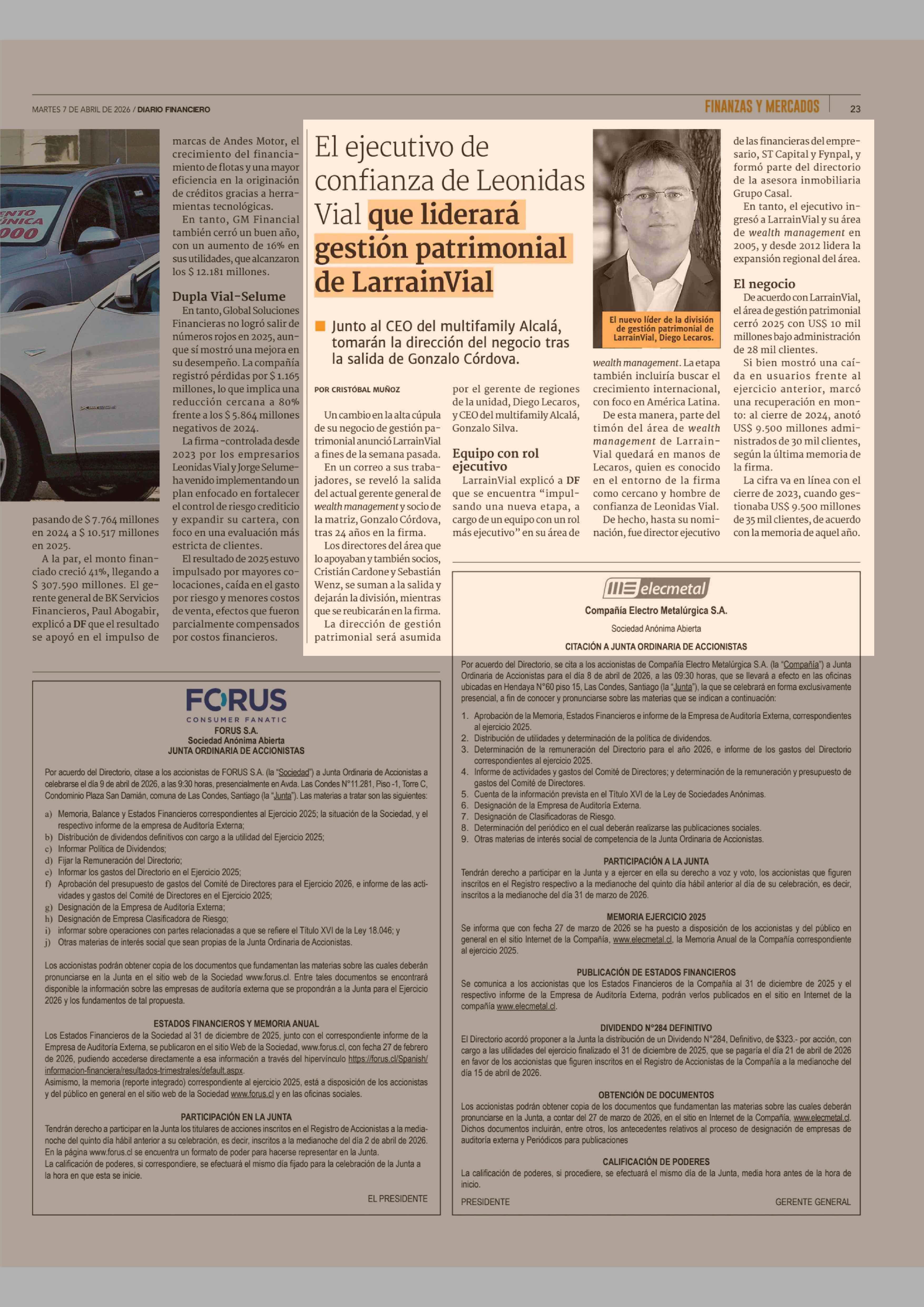 El ejecutivo de confianza de Leonidas Vial que liderará gestión patrimonial de LarrainVial 07-04-2026 Diario Financiero |
