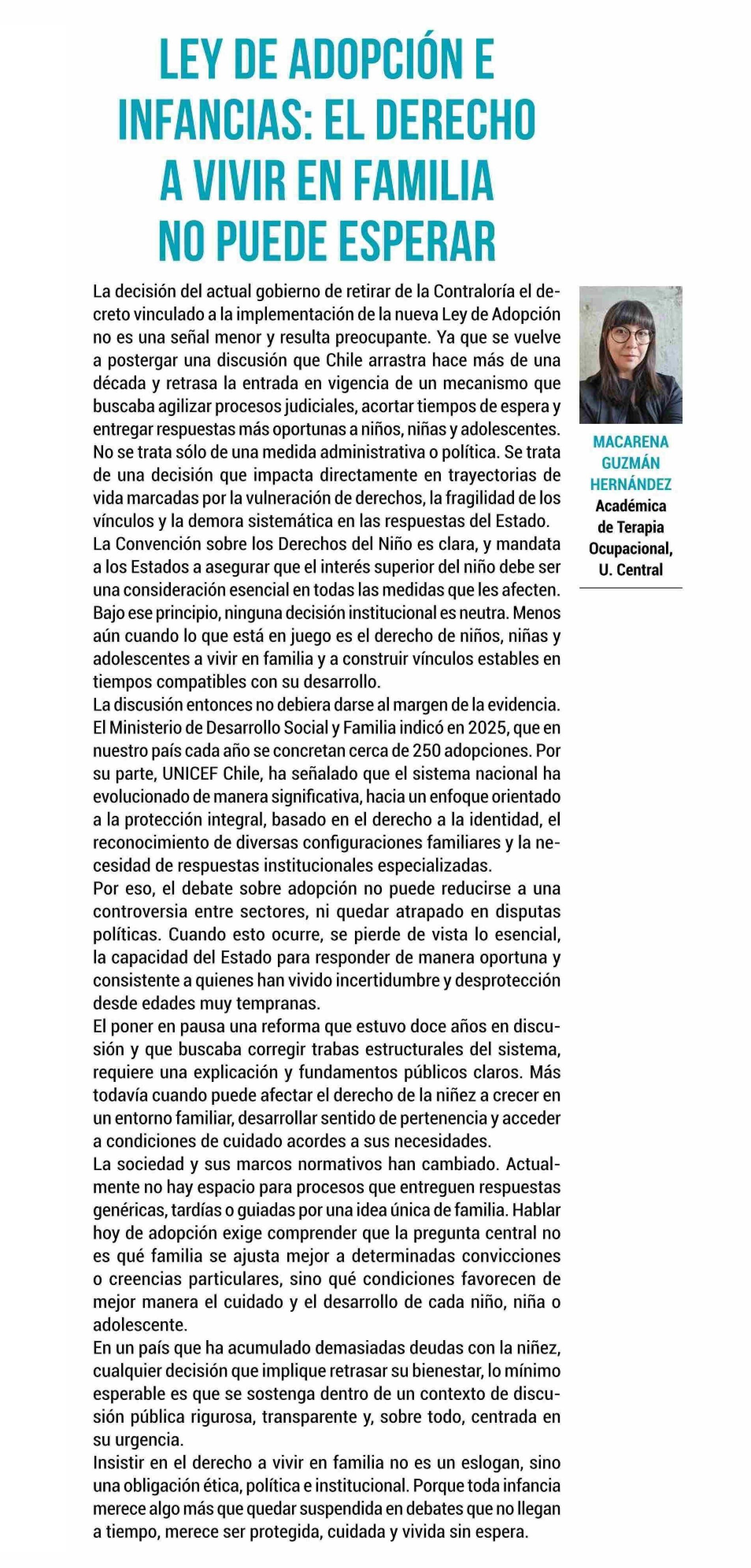 Título: COLUMNAS DE OPINIÓN: LEY DE ADOPCIÓN E INFANCIAS: EL DERECHO A VIVIR EN FAMILIA NO PUEDE ESPERAR