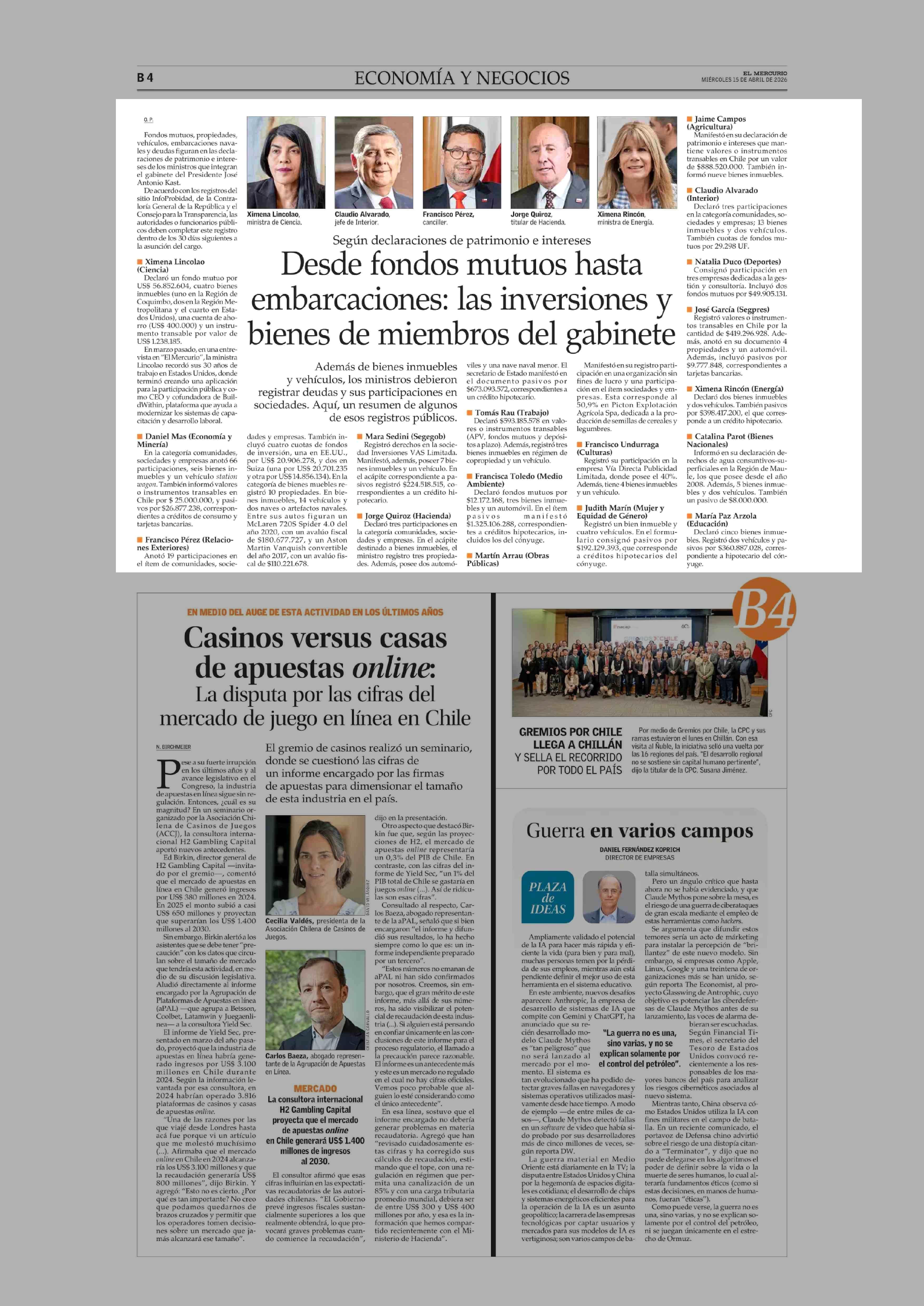 Desde fondos mutuos hasta embarcaciones: las inversiones y bienes de miembros del gabinete 15-04-2026 El Mercurio |