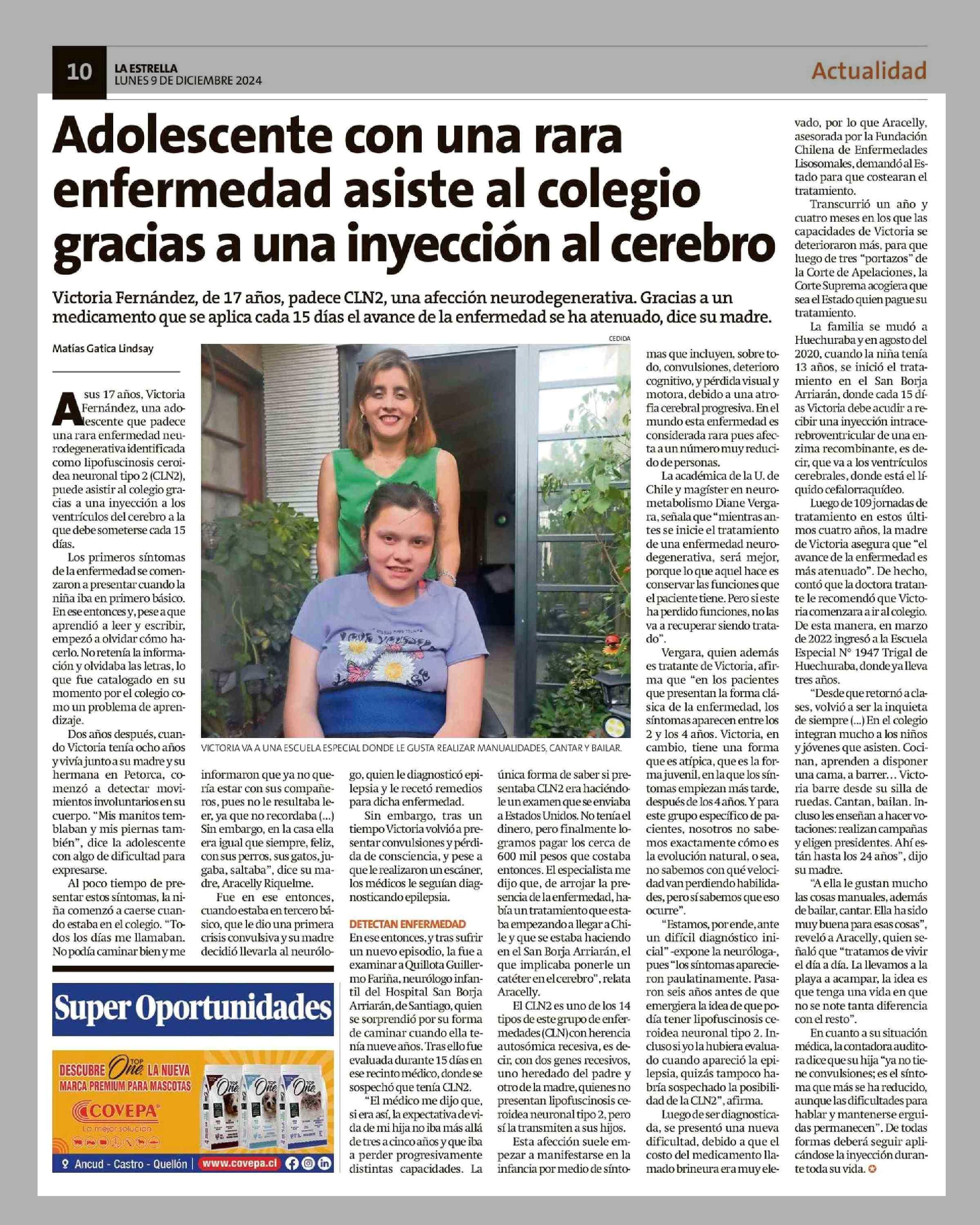Adolescente con una rara enfermedad asiste al colegio gracias a una inyección al cerebro 09-12-2024 La Estrella de Chiloé |
