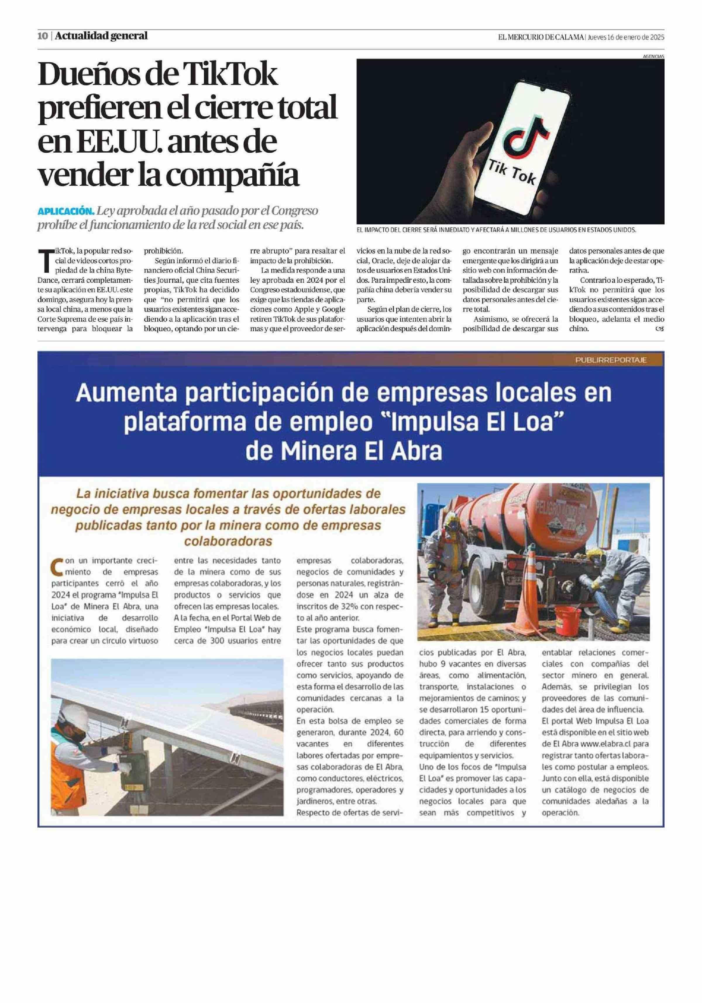 Aumenta participación de empresas locales en DETER E de Minera El Abra 16-01-2025 El Mercurio de Calama |