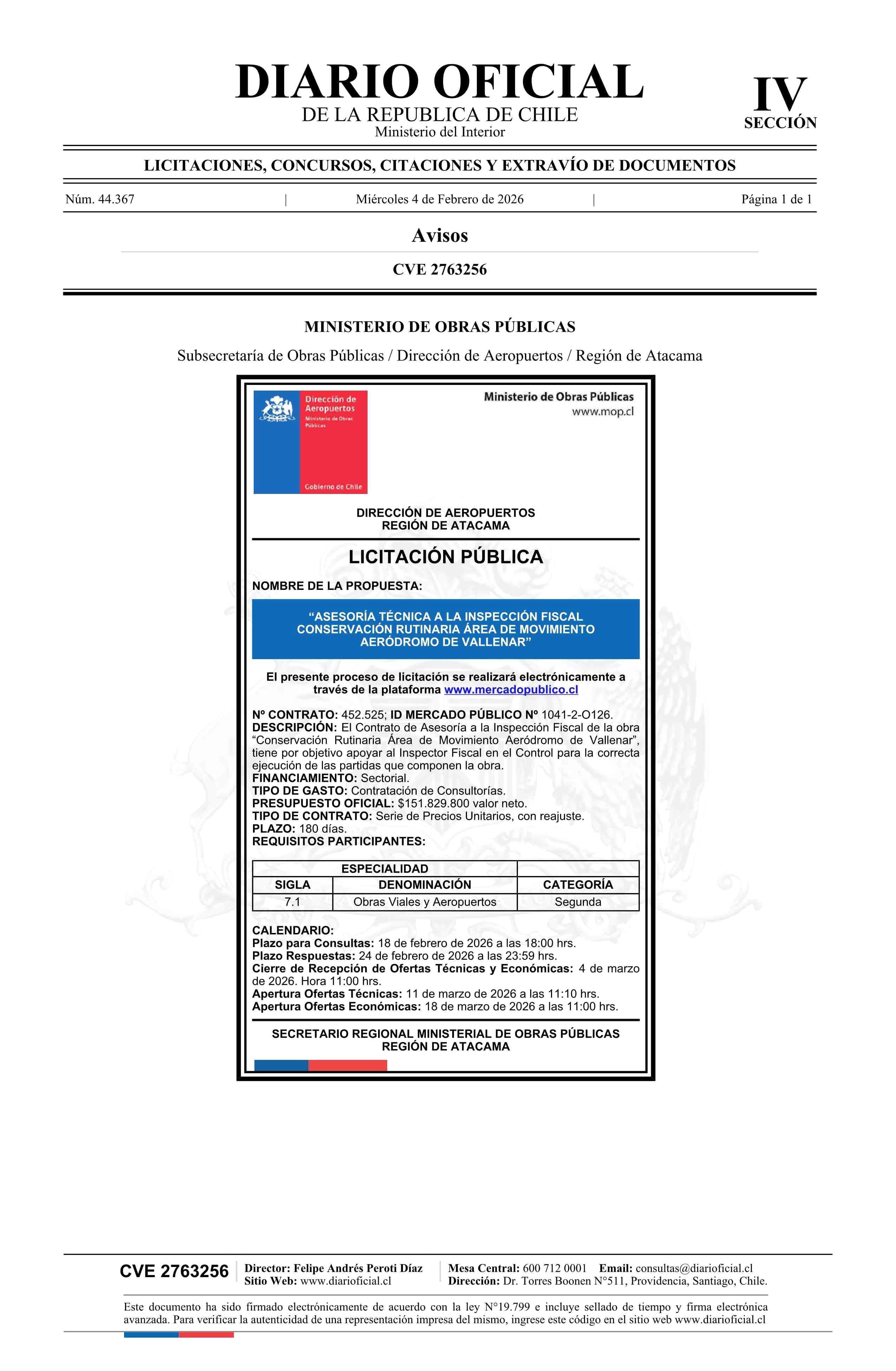 AVISO LICITACIONES: Asesoría Técnica a la Inspección Fiscal Conservación Rutinaria Área de Movimiento Aeródromo de Vallenar 04-02-2026 Diario Oficial Edición Electrónica |