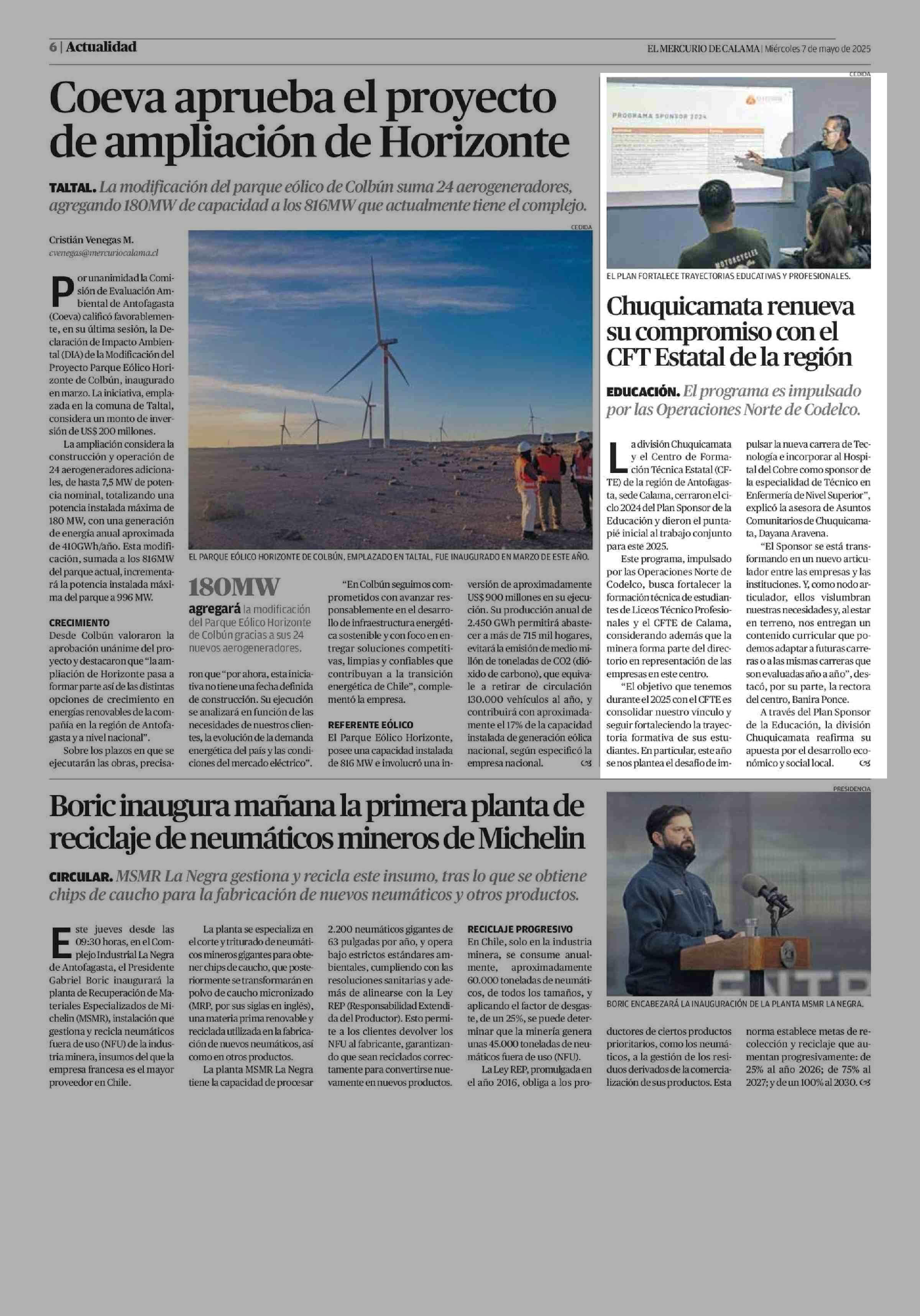 Chuquicamata renueva su compromiso con el CFT Estatal de la región 07-05-2025 El Mercurio de Calama |