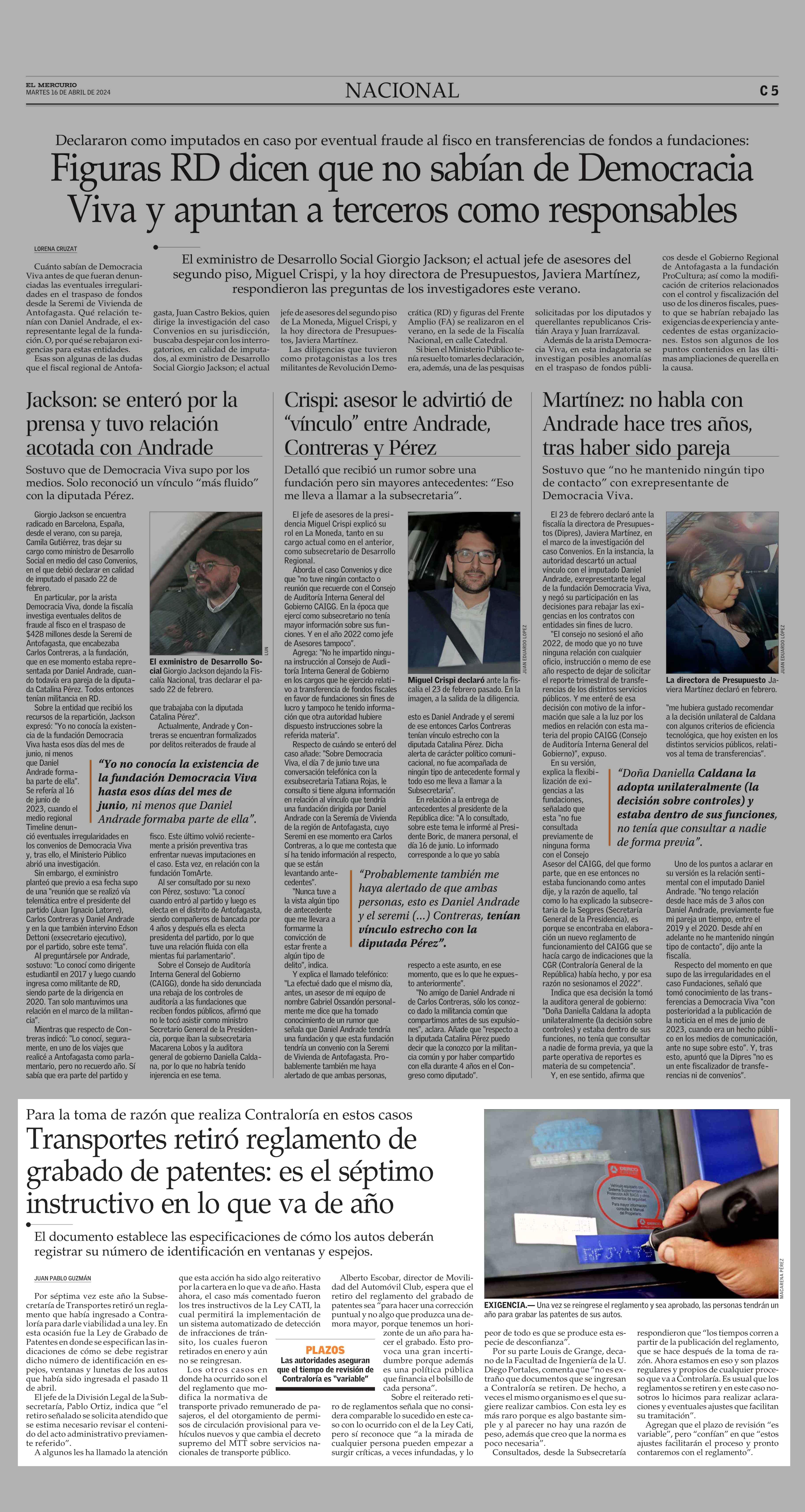 Transportes retiró reglamento de grabado de patentes: es el séptimo instructivo en lo que va de año 16-04-2024 El Mercurio |