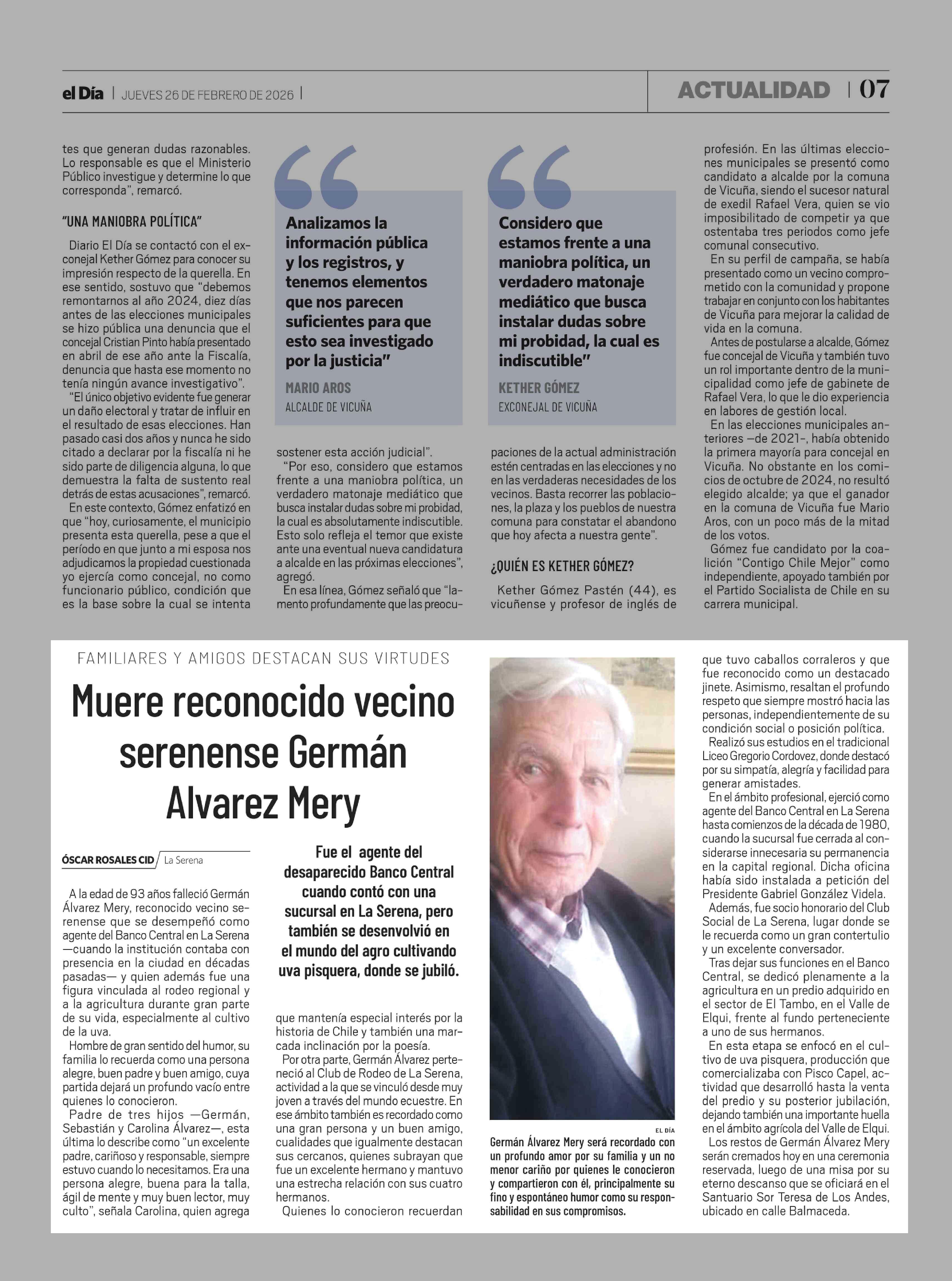 Muere reconocido vecino serenense Germán Alvarez Mery 26-02-2026 El Día |