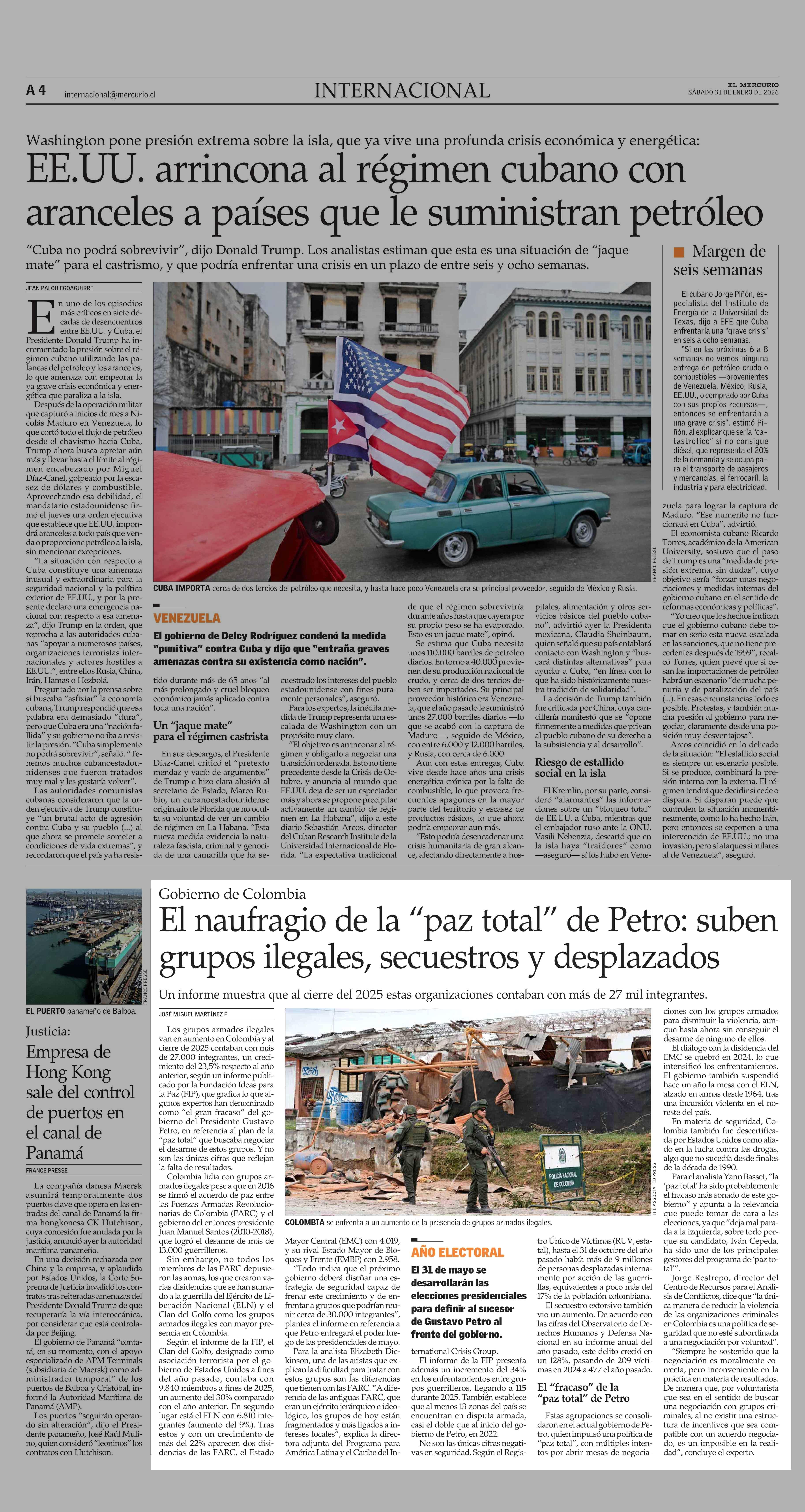El naufragio de la “paz total” de Petro: suben grupos ilegales, secuestros y desplazados 31-01-2026 El Mercurio |