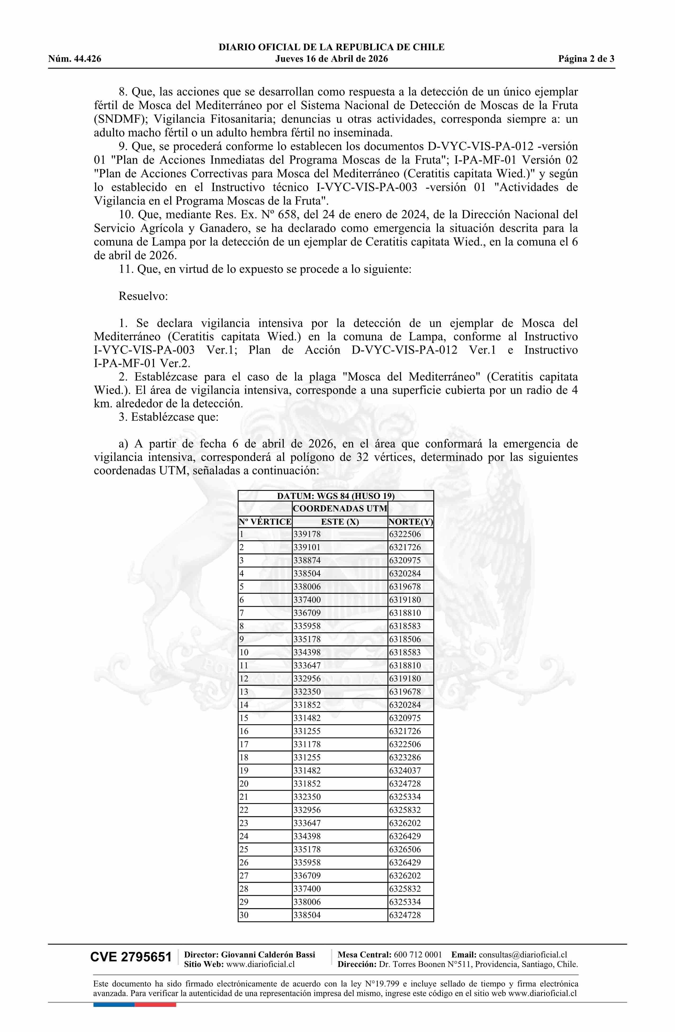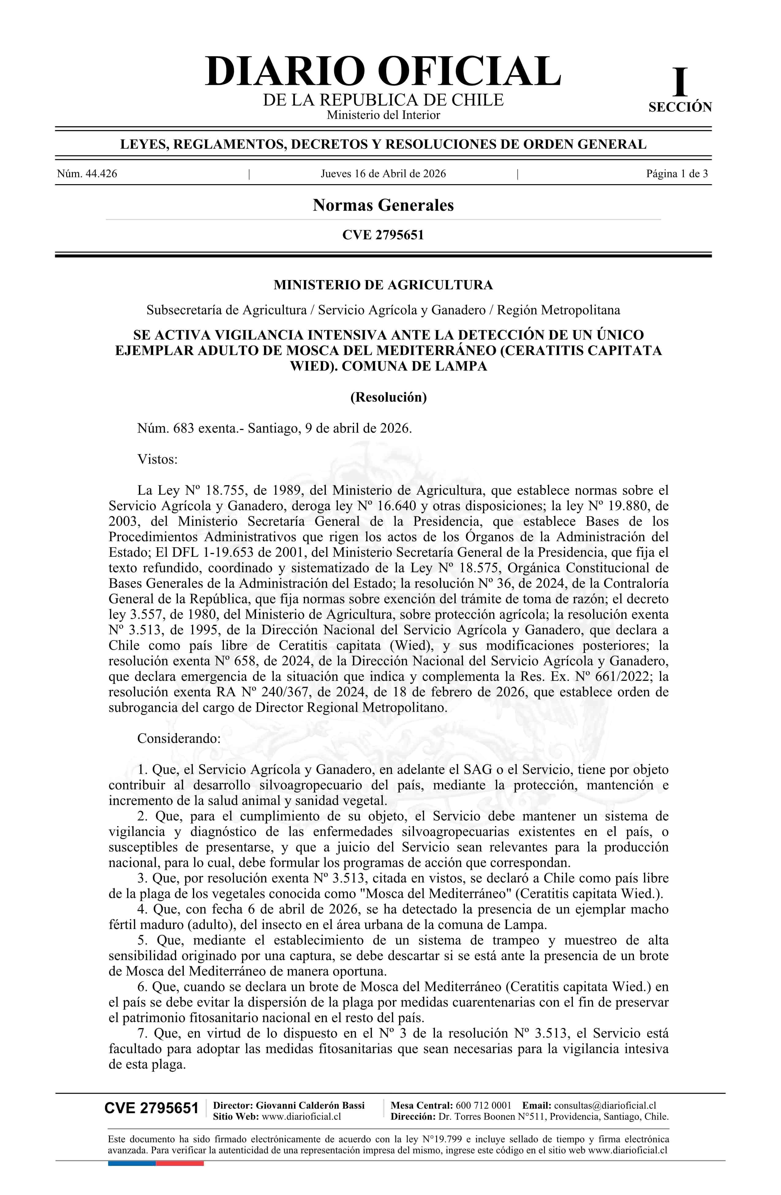 Resolución exenta número 683, de 2026.- Activa vigilancia intensiva ante la detección de un único ejemplar adulto de Mosca del Mediterráneo (Ceratitis capitata Wied), comuna de Lampa 16-04-2026 Diario Oficial Edición Electrónica |