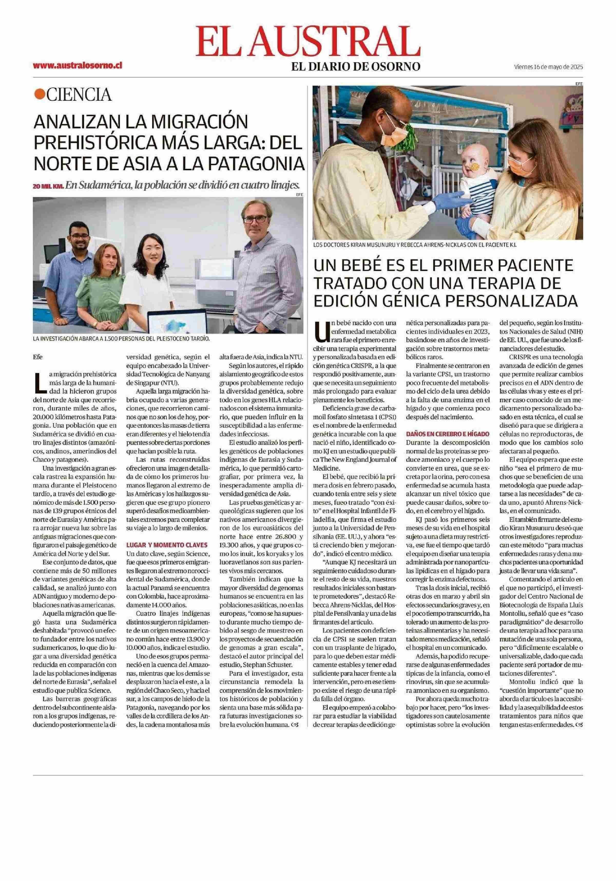 UN BEBÉ ES EL PRIMER PACIENTE TRATADO CON UNA TERAPIA DE EDICION GENICA PERSONALIZADA 16-05-2025 El Austral de Osorno |