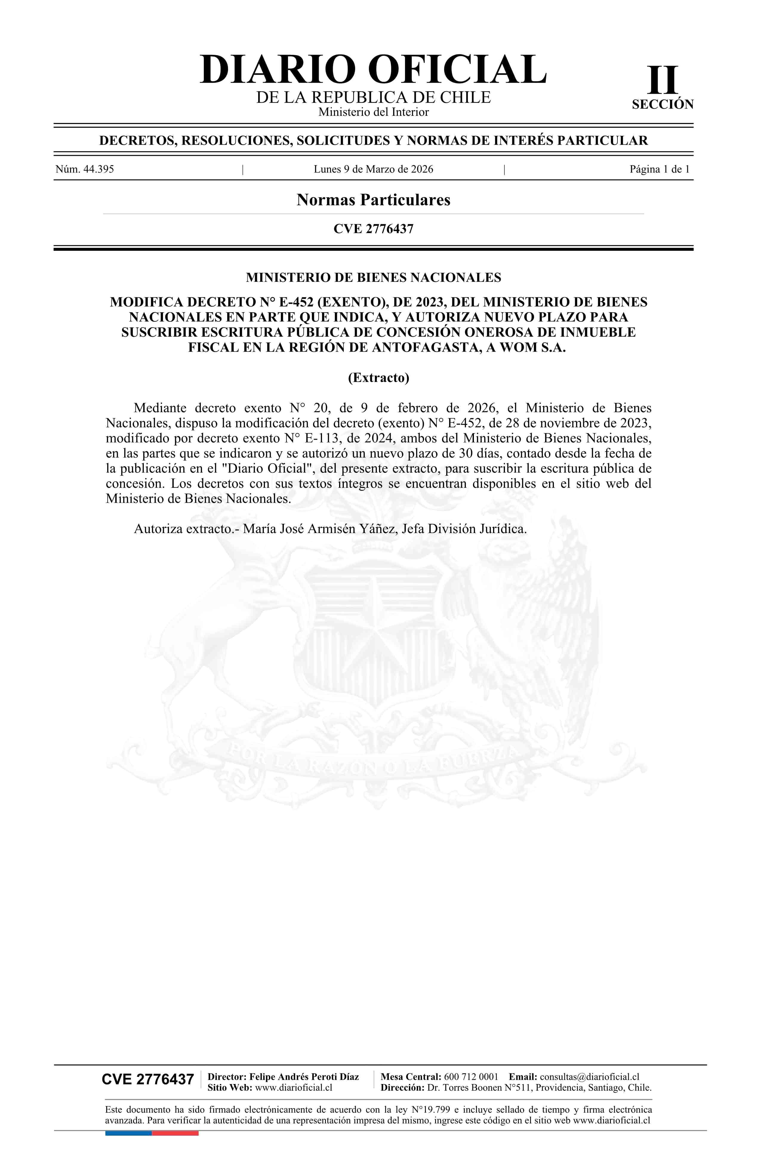 | Título: | Extracto de decreto exento número 20, de 2026.- Modifica decreto N° E-452 exento, de 2023, en parte que indica, y autoriza nuevo plazo para suscribir escritura pública de concesión onerosa de inmueble fiscal en la Región de Antofagasta, a Wom S.A. |