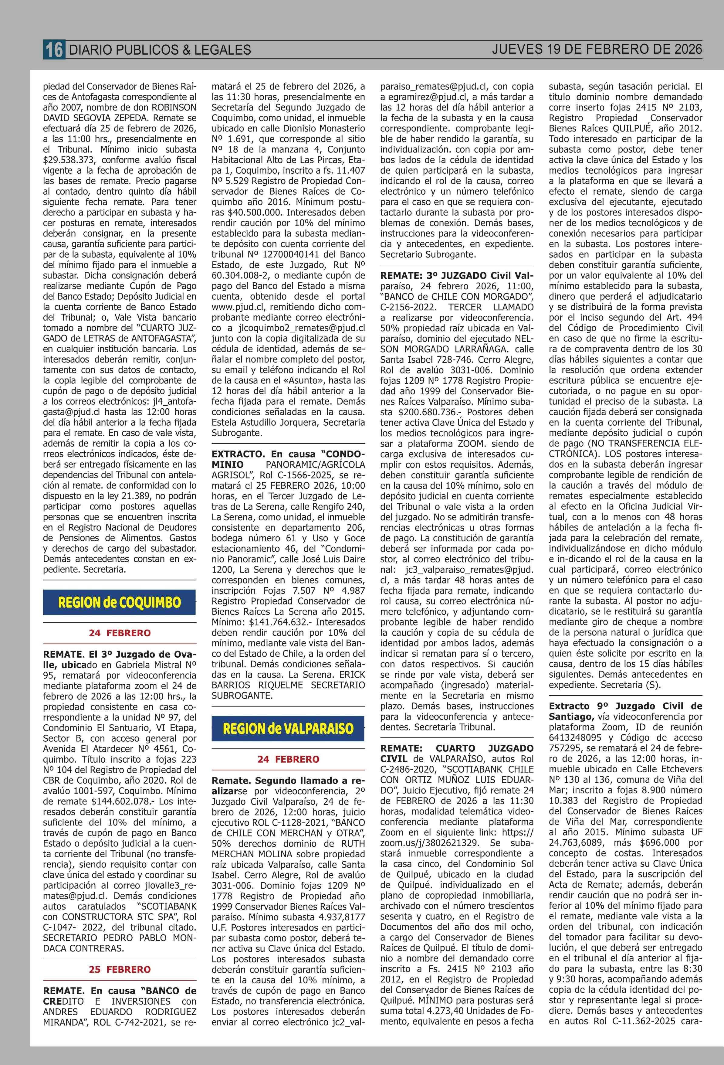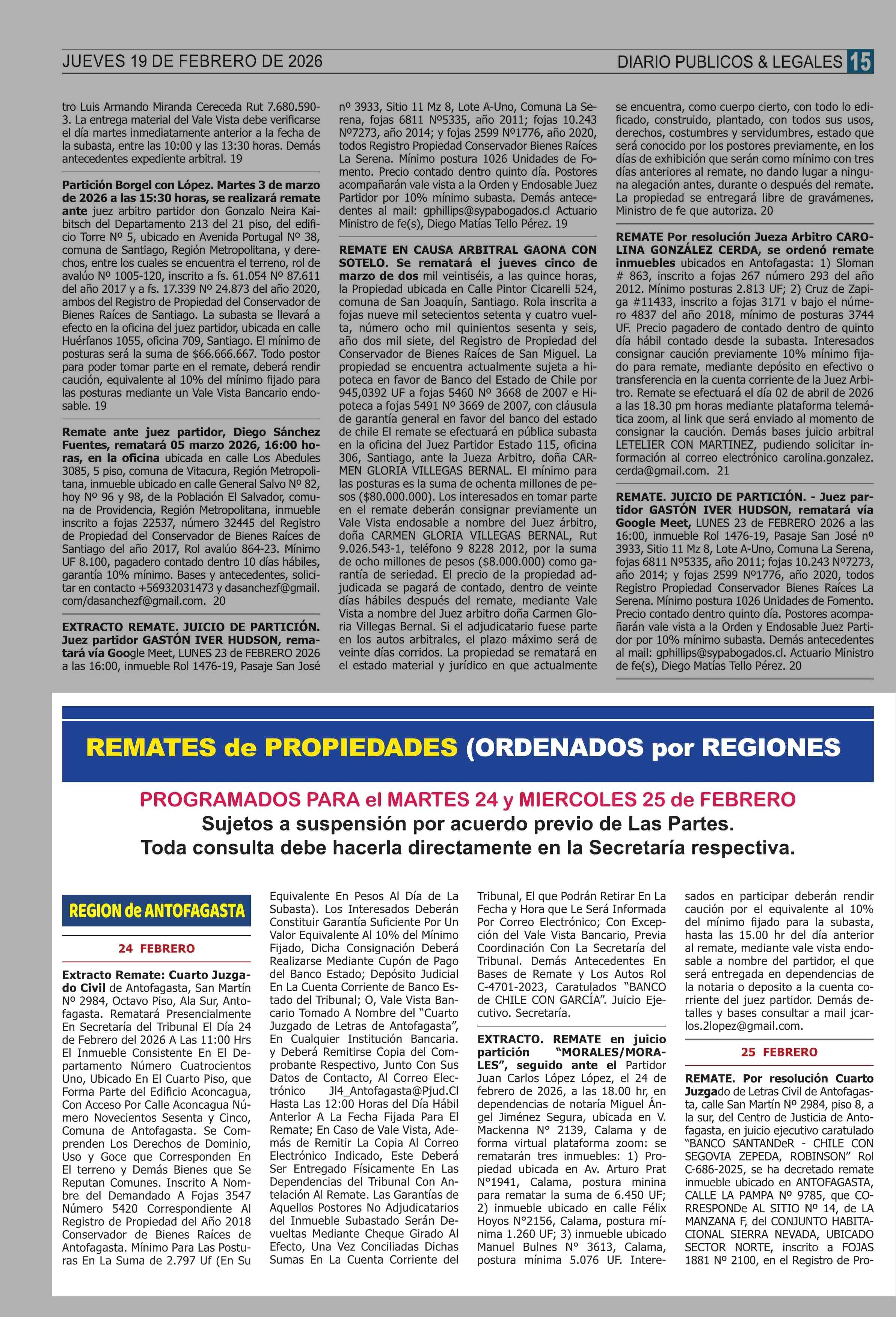 REMATES: REMATES de PROPIEDADES (ORDENADOS por REGIONES 19-02-2026 P&L Públicos y Legales |