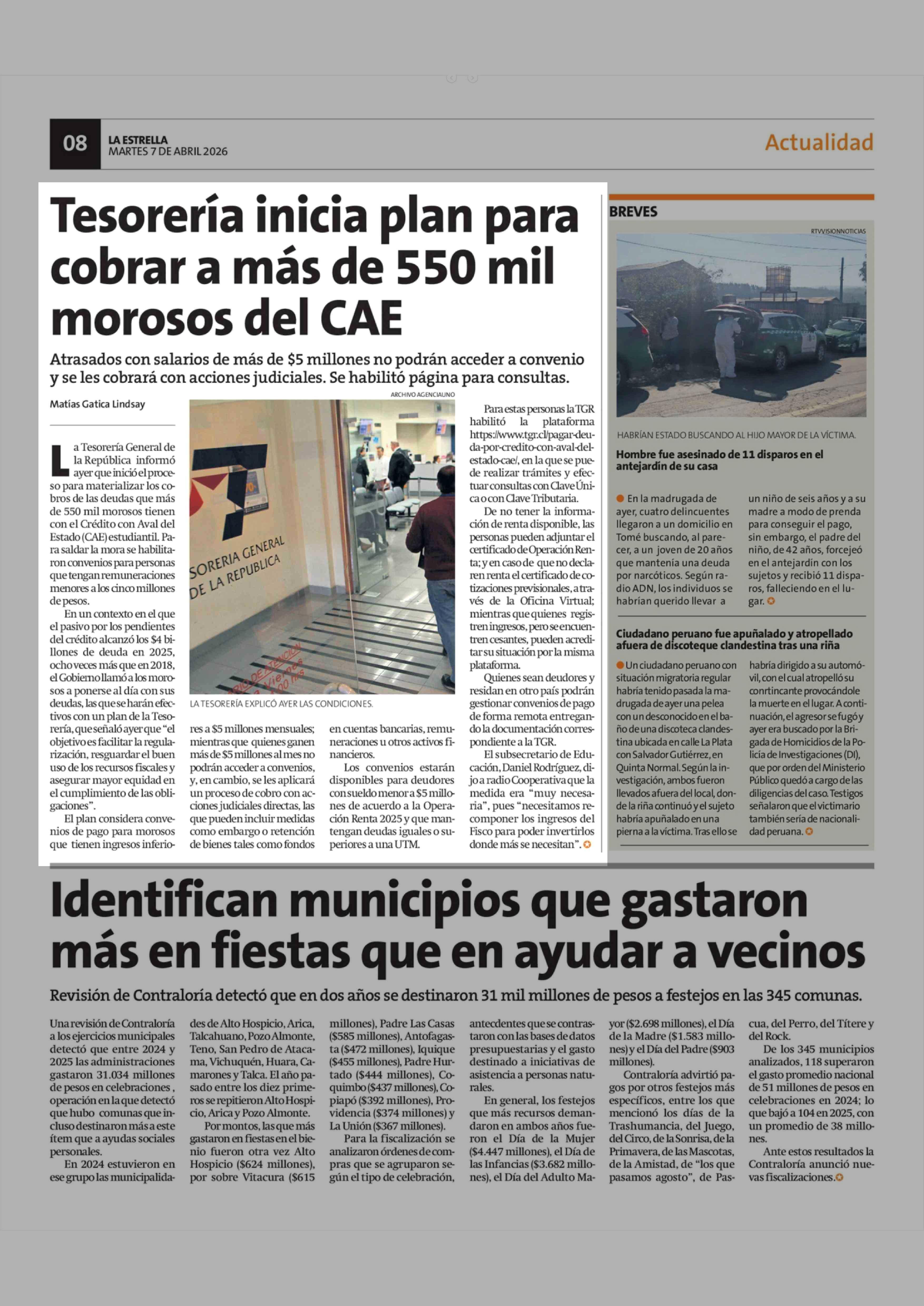 Tesorería inicia plan para cobrar a más de 550 mil morosos del CAE 07-04-2026 La Estrella de Concepción |