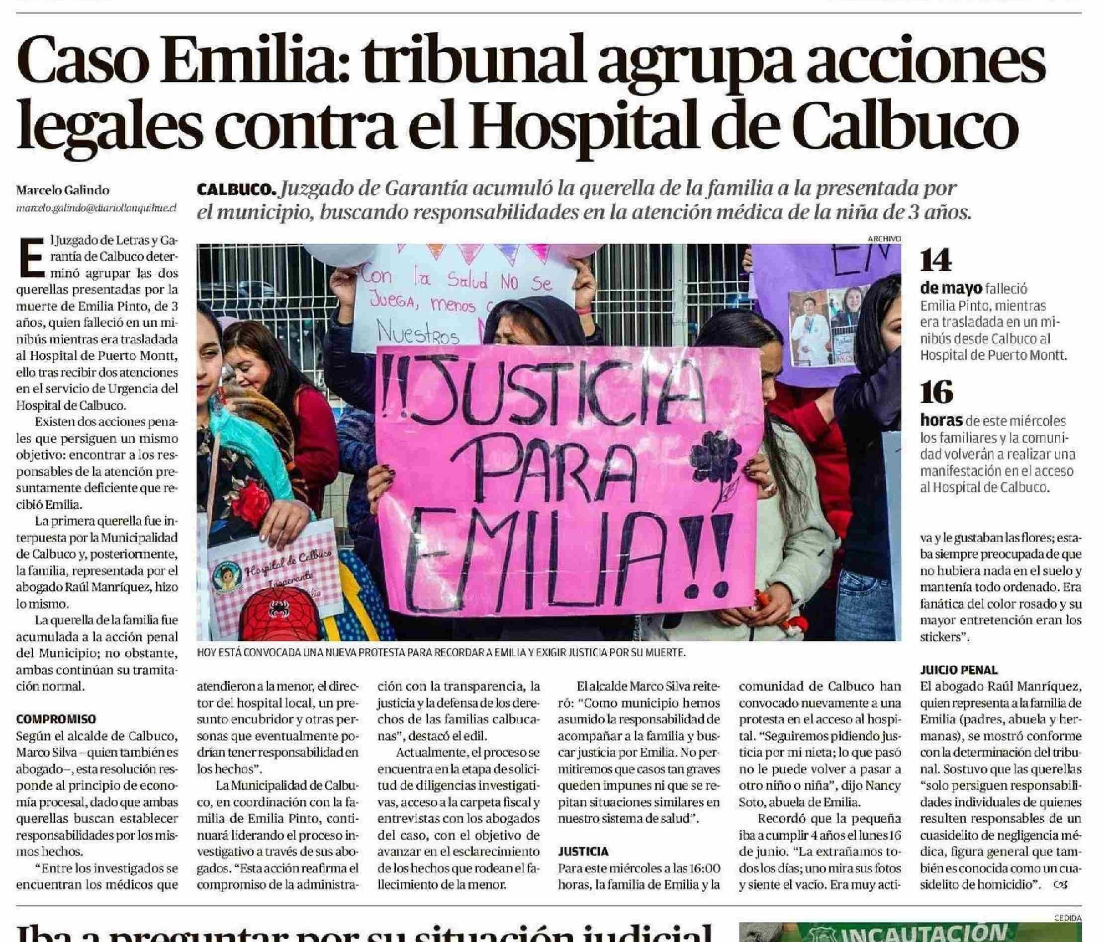Caso Emilia: tribunal agrupa acciones legales contra el Hospital de Calbuco 04-06-2025 El Llanquihue |