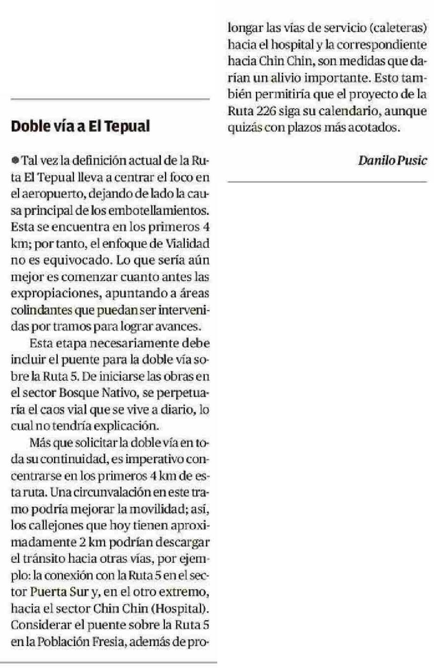 CARTAS: Doble vía a El Tepual 04-06-2025 El Llanquihue |
